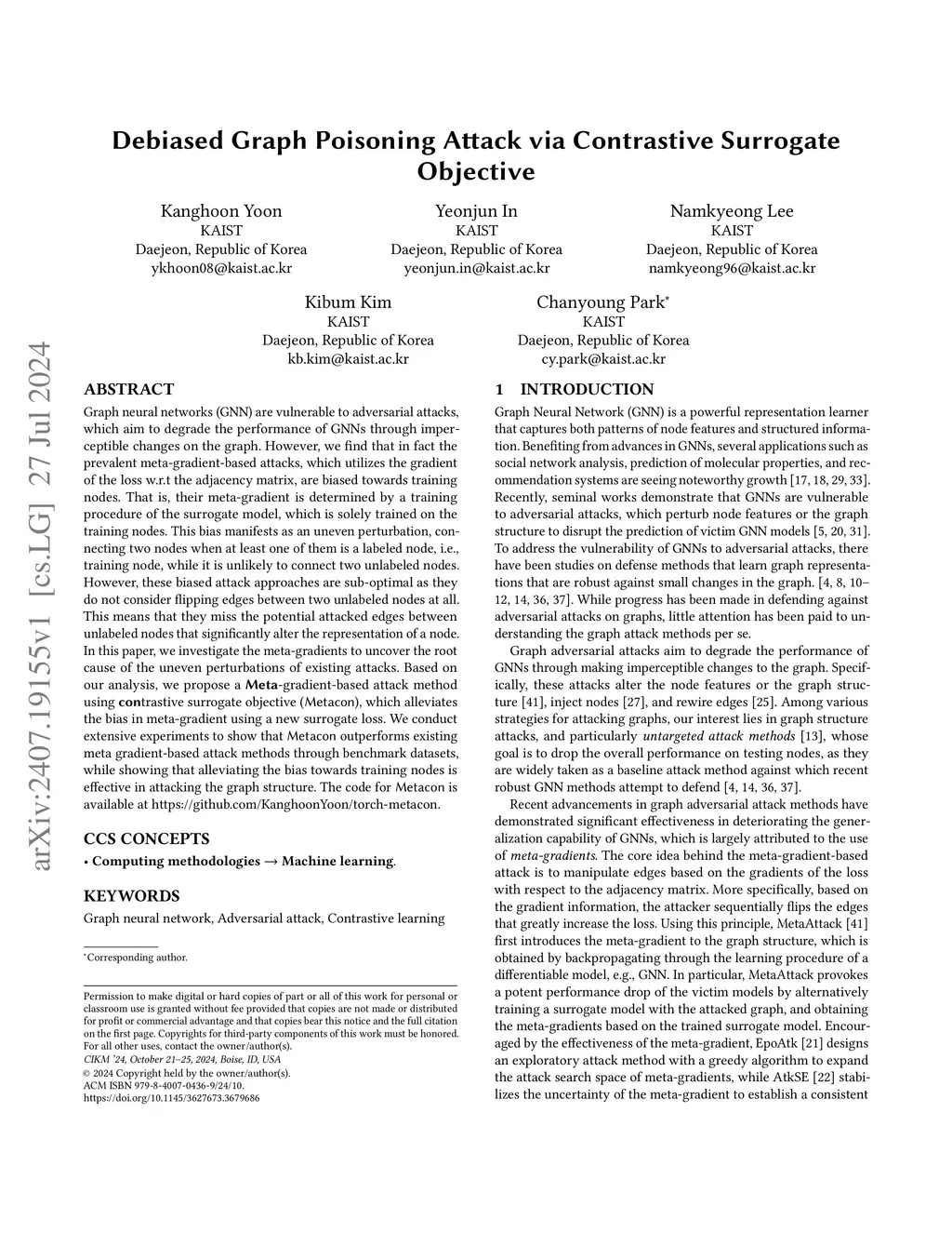 Graph neural networks (GNN) are vulnerable to adversarial attacks, which aim to degrade the performance of GNNs through imperceptible changes on the graph. However, we find that in fact the prevalent meta-gradient-based attacks, which utilizes the gradient of the loss w.r.t the adjacency matrix, are biased towards training nodes. That is, their meta-gradient is determined by a training procedure of the surrogate model, which is solely trained on the training nodes. This bias manifests as an uneven perturbation, connecting two nodes when at least one of them is a labeled node, i.e., training node, while it is unlikely to connect two unlabeled nodes. However, these biased attack approaches are sub-optimal as they do not consider flipping edges between two unlabeled nodes at all. This means that they miss the potential attacked edges between unlabeled nodes that significantly alter the representation of a node. In this paper, we investigate the meta-gradients to uncover the root cause of the uneven perturbations of existing attacks. Based on our analysis, we propose a Meta-gradient-based attack method using contrastive surrogate objective (Metacon), which alleviates the bias in meta-gradient using a new surrogate loss. We conduct extensive experiments to show that Metacon outperforms existing meta gradient-based attack methods through benchmark datasets, while showing that alleviating the bias towards training nodes is effective in attacking the graph structure.