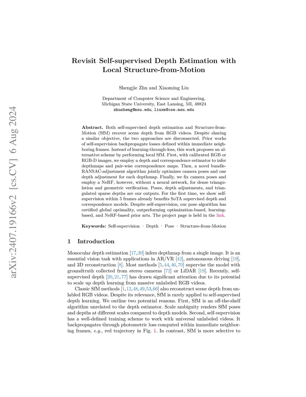 Both self-supervised depth estimation and Structure-from-Motion (SfM) recover scene depth from RGB videos. Despite sharing a similar objective, the two approaches are disconnected. Prior works of self-supervision backpropagate losses defined within immediate neighboring frames. Instead of learning-through-loss, this work proposes an alternative scheme by performing local SfM. First, with calibrated RGB or RGB-D images, we employ a depth and correspondence estimator to infer depthmaps and pair-wise correspondence maps. Then, a novel bundle-RANSAC-adjustment algorithm jointly optimizes camera poses and one depth adjustment for each depthmap. Finally, we fix camera poses and employ a NeRF, however, without a neural network, for dense triangulation and geometric verification. Poses, depth adjustments, and triangulated sparse depths are our outputs. For the first time, we show self-supervision within frames already benefits SoTA supervised depth and correspondence models. The project page is held in the link (https://shngjz.github.io/SSfM.github.io/).