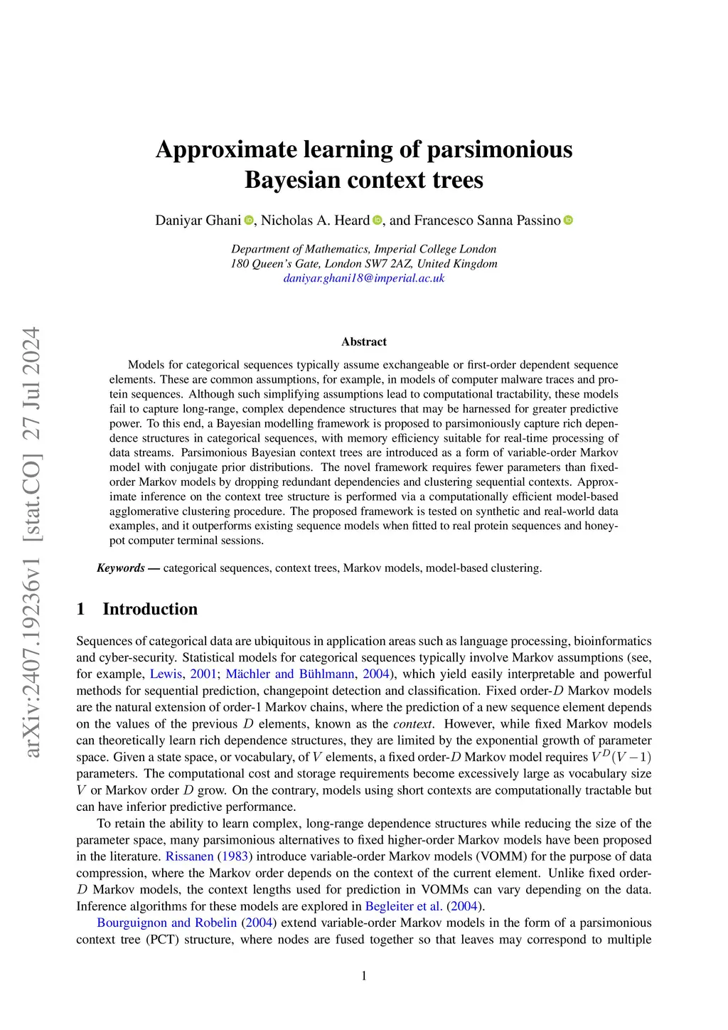 Models for categorical sequences typically assume exchangeable or first-order dependent sequence elements. These are common assumptions, for example, in models of computer malware traces and protein sequences. Although such simplifying assumptions lead to computational tractability, these models fail to capture long-range, complex dependence structures that may be harnessed for greater predictive power. To this end, a Bayesian modelling framework is proposed to parsimoniously capture rich dependence structures in categorical sequences, with memory efficiency suitable for real-time processing of data streams. Parsimonious Bayesian context trees are introduced as a form of variable-order Markov model with conjugate prior distributions. The novel framework requires fewer parameters than fixed-order Markov models by dropping redundant dependencies and clustering sequential contexts. Approximate inference on the context tree structure is performed via a computationally efficient model-based agglomerative clustering procedure. The proposed framework is tested on synthetic and real-world data examples, and it outperforms existing sequence models when fitted to real protein sequences and honeypot computer terminal sessions.