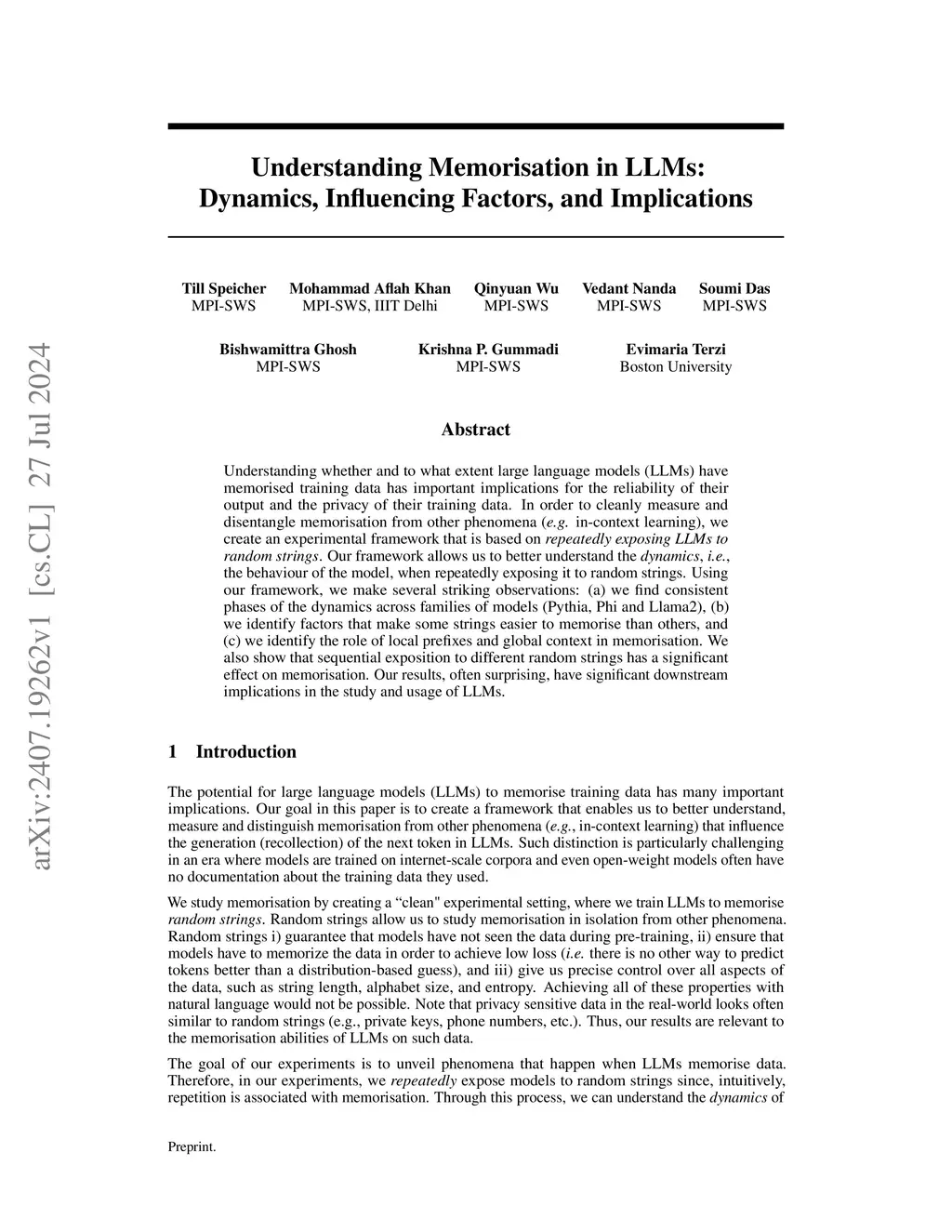 Understanding whether and to what extent large language models (LLMs) have memorised training data has important implications for the reliability of their output and the privacy of their training data. In order to cleanly measure and disentangle memorisation from other phenomena (e.g. in-context learning), we create an experimental framework that is based on repeatedly exposing LLMs to random strings. Our framework allows us to better understand the dynamics, i.e., the behaviour of the model, when repeatedly exposing it to random strings. Using our framework, we make several striking observations: (a) we find consistent phases of the dynamics across families of models (Pythia, Phi and Llama2), (b) we identify factors that make some strings easier to memorise than others, and (c) we identify the role of local prefixes and global context in memorisation. We also show that sequential exposition to different random strings has a significant effect on memorisation. Our results, often surprising, have significant downstream implications in the study and usage of LLMs.