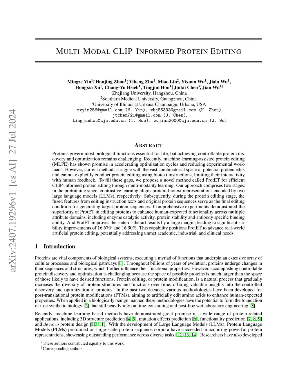 Proteins govern most biological functions essential for life, but achieving controllable protein discovery and optimization remains challenging. Recently, machine learning-assisted protein editing (MLPE) has shown promise in accelerating optimization cycles and reducing experimental workloads. However, current methods struggle with the vast combinatorial space of potential protein edits and cannot explicitly conduct protein editing using biotext instructions, limiting their interactivity with human feedback. To fill these gaps, we propose a novel method called ProtET for efficient CLIP-informed protein editing through multi-modality learning. Our approach comprises two stages: in the pretraining stage, contrastive learning aligns protein-biotext representations encoded by two large language models (LLMs), respectively. Subsequently, during the protein editing stage, the fused features from editing instruction texts and original protein sequences serve as the final editing condition for generating target protein sequences. Comprehensive experiments demonstrated the superiority of ProtET in editing proteins to enhance human-expected functionality across multiple attribute domains, including enzyme catalytic activity, protein stability and antibody specific binding ability. And ProtET improves the state-of-the-art results by a large margin, leading to significant stability improvements of 16.67% and 16.90%. This capability positions ProtET to advance real-world artificial protein editing, potentially addressing unmet academic, industrial, and clinical needs.