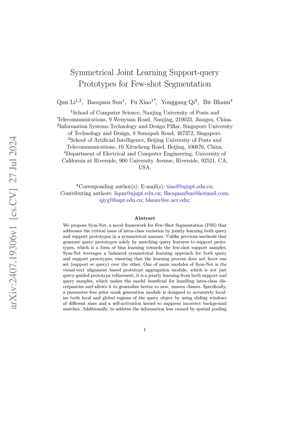 We propose Sym-Net, a novel framework for Few-Shot Segmentation (FSS) that addresses the critical issue of intra-class variation by jointly learning both query and support prototypes in a symmetrical manner. Unlike previous methods that generate query prototypes solely by matching query features to support prototypes, which is a form of bias learning towards the few-shot support samples, Sym-Net leverages a balanced symmetrical learning approach for both query and support prototypes, ensuring that the learning process does not favor one set (support or query) over the other. One of main modules of Sym-Net is the visual-text alignment-based prototype aggregation module, which is not just query-guided prototype refinement, it is a jointly learning from both support and query samples, which makes the model beneficial for handling intra-class discrepancies and allows it to generalize better to new, unseen classes. Specifically, a parameter-free prior mask generation module is designed to accurately localize both local and global regions of the query object by using sliding windows of different sizes and a self-activation kernel to suppress incorrect background matches. Additionally, to address the information loss caused by spatial pooling during prototype learning, a top-down hyper-correlation module is integrated to capture multi-scale spatial relationships between support and query images. This approach is further jointly optimized by implementing a co-optimized hard triplet mining strategy. Experimental results show that the proposed Sym-Net outperforms state-of-the-art models, which demonstrates that jointly learning support-query prototypes in a symmetrical manner for FSS offers a promising direction to enhance segmentation performance with limited annotated data.