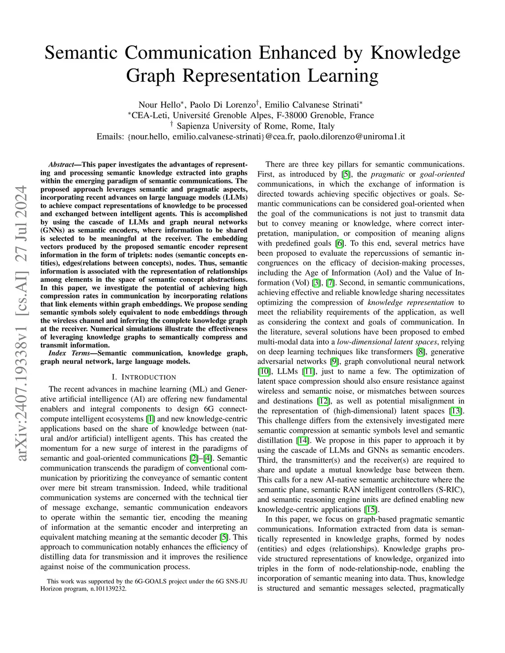 This paper investigates the advantages of representing and processing semantic knowledge extracted into graphs within the emerging paradigm of semantic communications. The proposed approach leverages semantic and pragmatic aspects, incorporating recent advances on large language models (LLMs) to achieve compact representations of knowledge to be processed and exchanged between intelligent agents. This is accomplished by using the cascade of LLMs and graph neural networks (GNNs) as semantic encoders, where information to be shared is selected to be meaningful at the receiver. The embedding vectors produced by the proposed semantic encoder represent information in the form of triplets: nodes (semantic concepts entities), edges(relations between concepts), nodes. Thus, semantic information is associated with the representation of relationships among elements in the space of semantic concept abstractions. In this paper, we investigate the potential of achieving high compression rates in communication by incorporating relations that link elements within graph embeddings. We propose sending semantic symbols solely equivalent to node embeddings through the wireless channel and inferring the complete knowledge graph at the receiver. Numerical simulations illustrate the effectiveness of leveraging knowledge graphs to semantically compress and transmit information.
