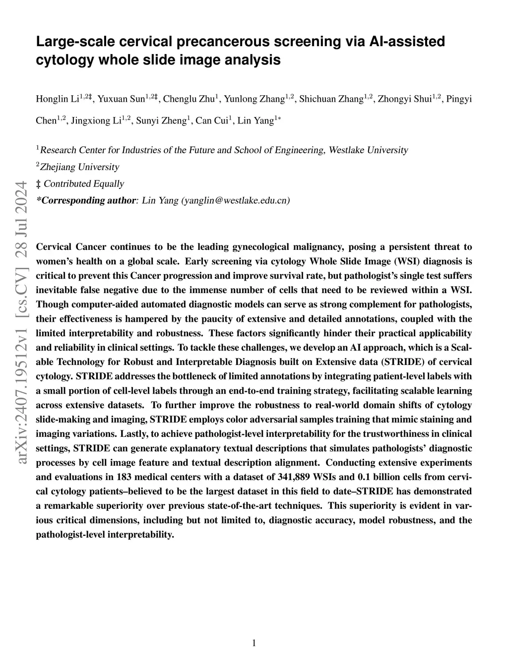Large-scale cervical precancerous screening via AI-assisted cytology