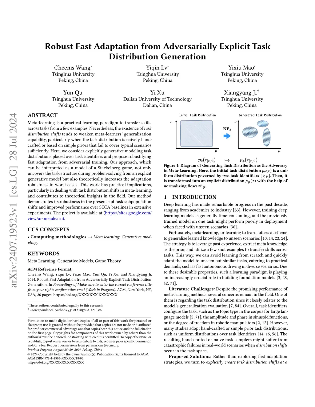 Meta-learning is a practical learning paradigm to transfer skills across tasks from a few examples. Nevertheless, the existence of task distribution shifts tends to weaken meta-learners' generalization capability, particularly when the training task distribution is naively hand-crafted or based on simple priors that fail to cover critical scenarios sufficiently. Here, we consider explicitly generative modeling task distributions placed over task identifiers and propose robustifying fast adaptation from adversarial training. Our approach, which can be interpreted as a model of a Stackelberg game, not only uncovers the task structure during problem-solving from an explicit generative model but also theoretically increases the adaptation robustness in worst cases. This work has practical implications, particularly in dealing with task distribution shifts in meta-learning, and contributes to theoretical insights in the field. Our method demonstrates its robustness in the presence of task subpopulation shifts and improved performance over SOTA baselines in extensive experiments. The code is available at the project sitethis https URL.