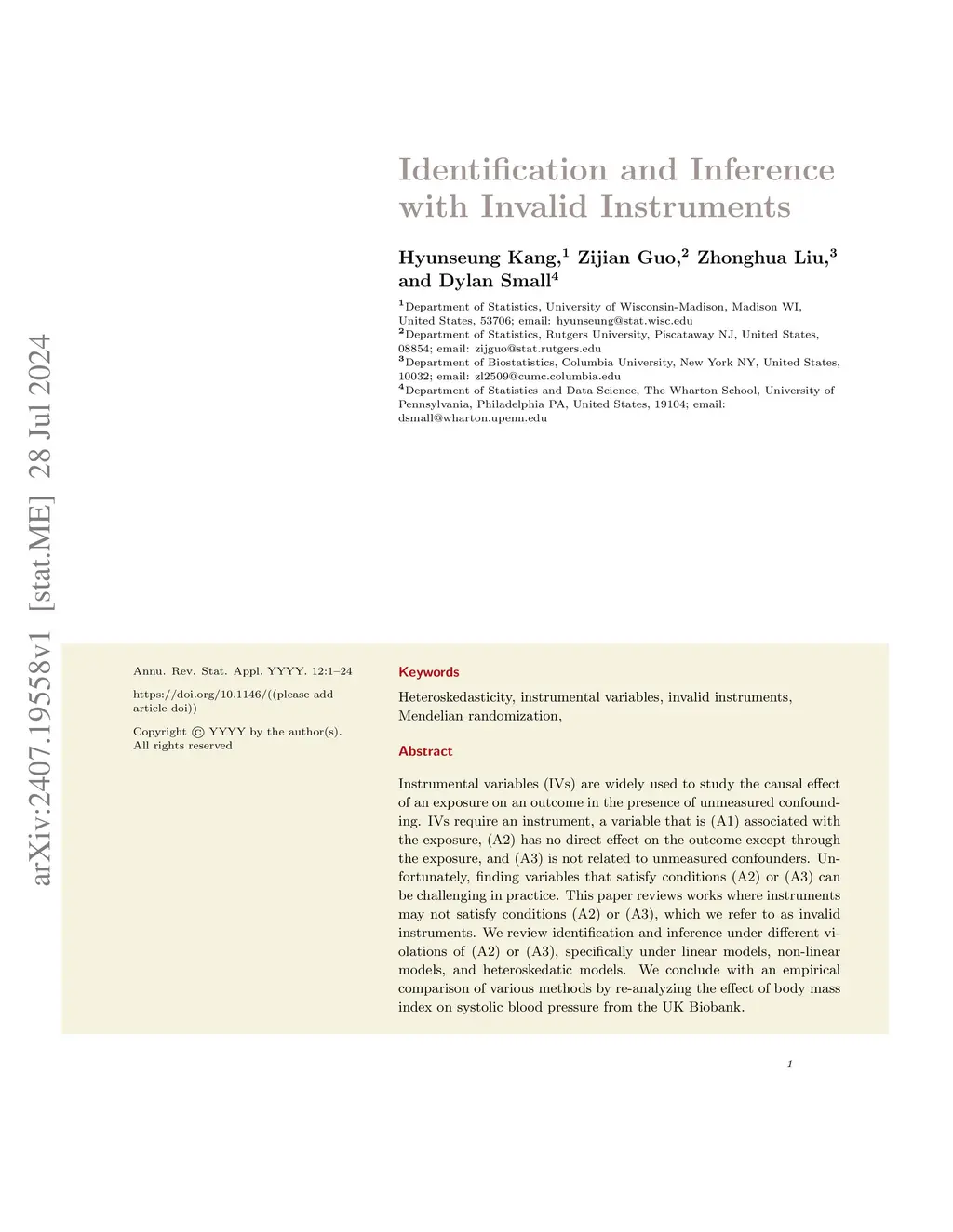 Instrumental variables (IVs) are widely used to study the causal effect of an exposure on an outcome in the presence of unmeasured confounding. IVs require an instrument, a variable that is (A1) associated with the exposure, (A2) has no direct effect on the outcome except through the exposure, and (A3) is not related to unmeasured confounders. Unfortunately, finding variables that satisfy conditions (A2) or (A3) can be challenging in practice. This paper reviews works where instruments may not satisfy conditions (A2) or (A3), which we refer to as invalid instruments. We review identification and inference under different violations of (A2) or (A3), specifically under linear models, non-linear models, and heteroskedatic models. We conclude with an empirical comparison of various methods by re-analyzing the effect of body mass index on systolic blood pressure from the UK Biobank.