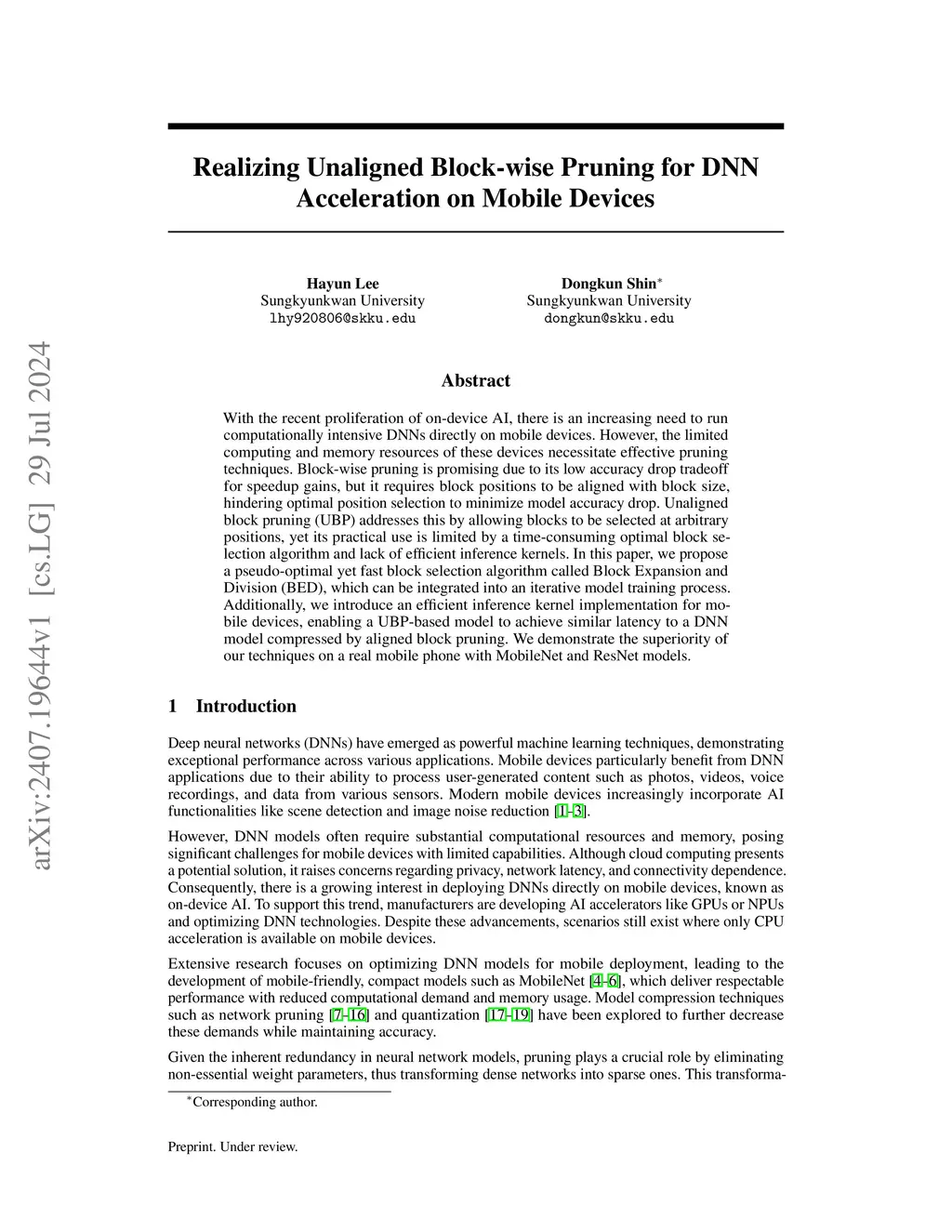With the recent proliferation of on-device AI, there is an increasing need to run computationally intensive DNNs directly on mobile devices. However, the limited computing and memory resources of these devices necessitate effective pruning techniques. Block-wise pruning is promising due to its low accuracy drop tradeoff for speedup gains, but it requires block positions to be aligned with block size, hindering optimal position selection to minimize model accuracy drop. Unaligned block pruning (UBP) addresses this by allowing blocks to be selected at arbitrary positions, yet its practical use is limited by a time-consuming optimal block selection algorithm and lack of efficient inference kernels. In this paper, we propose a pseudo-optimal yet fast block selection algorithm called Block Expansion and Division (BED), which can be integrated into an iterative model training process. Additionally, we introduce an efficient inference kernel implementation for mobile devices, enabling a UBP-based model to achieve similar latency to a DNN model compressed by aligned block pruning. We demonstrate the superiority of our techniques on a real mobile phone with MobileNet and ResNet models.