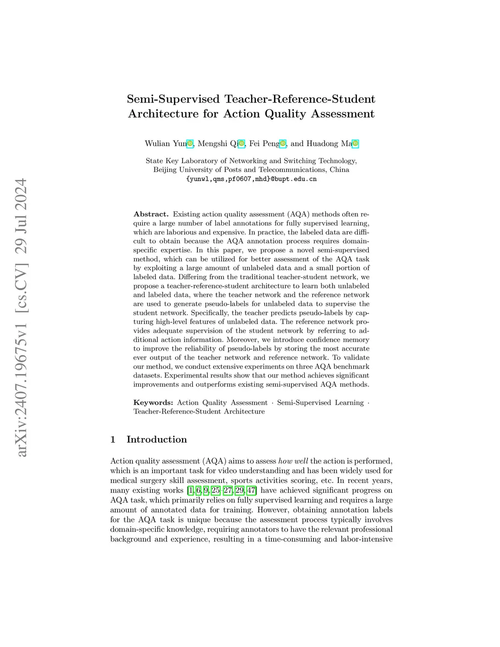 Semi-Supervised Teacher-Reference-Student Architecture for Action Quality Assessment