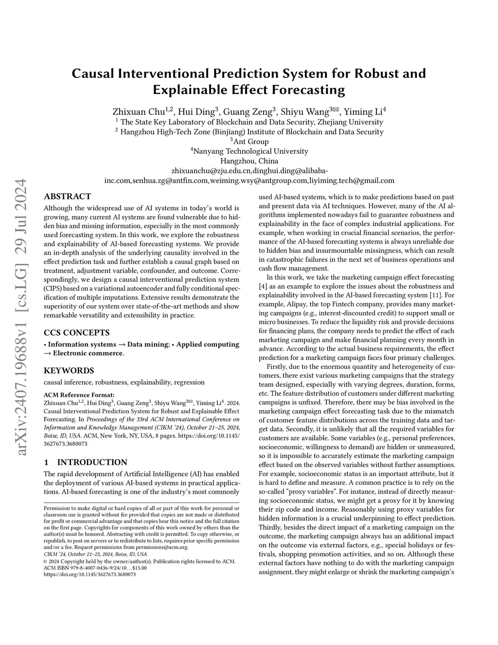 Although the widespread use of AI systems in today's world is growing, many current AI systems are found vulnerable due to hidden bias and missing information, especially in the most commonly used forecasting system. In this work, we explore the robustness and explainability of AI-based forecasting systems. We provide an in-depth analysis of the underlying causality involved in the effect prediction task and further establish a causal graph based on treatment, adjustment variable, confounder, and outcome. Correspondingly, we design a causal interventional prediction system (CIPS) based on a variational autoencoder and fully conditional specification of multiple imputations. Extensive results demonstrate the superiority of our system over state-of-the-art methods and show remarkable versatility and extensibility in practice.