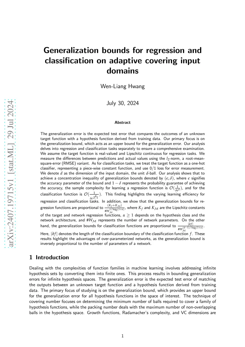 Our main focus is on the generalization bound, which serves as an upper limit for the generalization error. Our analysis delves into regression and classification tasks separately to ensure a thorough examination. We assume the target function is real-valued and Lipschitz continuous for regression tasks. We use the 2-norm and a root-mean-square-error (RMSE) variant to measure the disparities between predictions and actual values. In the case of classification tasks, we treat the target function as a one-hot classifier, representing a piece-wise constant function, and employ 0/1 loss for error measurement. Our analysis underscores the differing sample complexity required to achieve a concentration inequality of generalization bounds, highlighting the variation in learning efficiency for regression and classification tasks. Furthermore, we demonstrate that the generalization bounds for regression and classification functions are inversely proportional to a polynomial of the number of parameters in a network, with the degree depending on the hypothesis class and the network architecture. These findings emphasize the advantages of over-parameterized networks and elucidate the conditions for benign overfitting in such systems.
