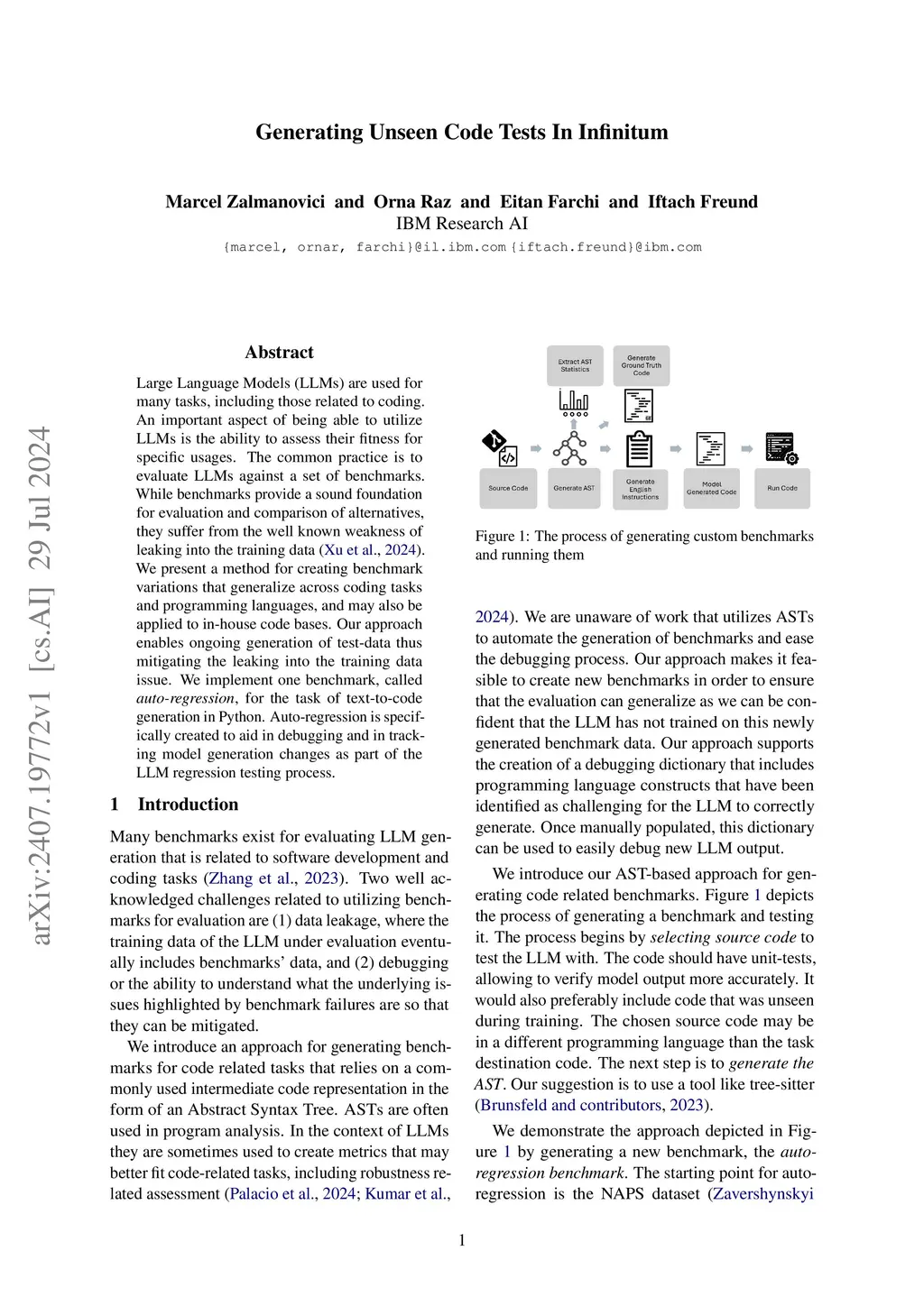 Large Language Models (LLMs) are used for many tasks, including those related to coding. An important aspect of being able to utilize LLMs is the ability to assess their fitness for specific usages. The common practice is to evaluate LLMs against a set of benchmarks. While benchmarks provide a sound foundation for evaluation and comparison of alternatives, they suffer from the well-known weakness of leaking into the training data \cite{Xu2024Benchmarking}. We present a method for creating benchmark variations that generalize across coding tasks and programming languages, and may also be applied to in-house code bases. Our approach enables ongoing generation of test-data thus mitigating the leaking into the training data issue. We implement one benchmark, called \textit{auto-regression}, for the task of text-to-code generation in Python. Auto-regression is specifically created to aid in debugging and in tracking model generation changes as part of the LLM regression testing process.