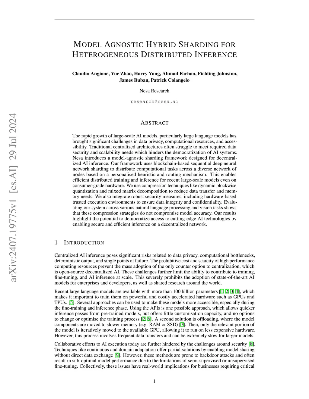 The rapid growth of large-scale AI models, particularly large language models has brought significant challenges in data privacy, computational resources, and accessibility. Traditional centralized architectures often struggle to meet required data security and scalability needs which hinders the democratization of AI systems. Nesa introduces a model-agnostic sharding framework designed for decentralized AI inference. Our framework uses blockchain-based sequential deep neural network sharding to distribute computational tasks across a diverse network of nodes based on a personalised heuristic and routing mechanism. This enables efficient distributed training and inference for recent large-scale models even on consumer-grade hardware. We use compression techniques like dynamic blockwise quantization and mixed matrix decomposition to reduce data transfer and memory needs. We also integrate robust security measures, including hardware-based trusted execution environments to ensure data integrity and confidentiality. Evaluating our system across various natural language processing and vision tasks shows that these compression strategies do not compromise model accuracy. Our results highlight the potential to democratize access to cutting-edge AI technologies by enabling secure and efficient inference on a decentralized network.