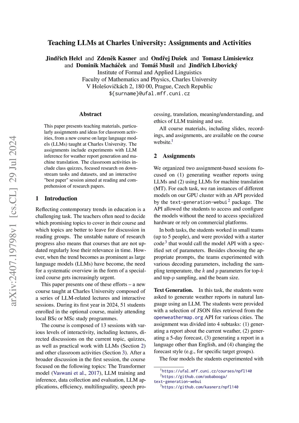 This paper presents teaching materials, particularly assignments and ideas for classroom activities, from a new course on large language models (LLMs) taught at Charles University. The assignments include experiments with LLM inference for weather report generation and machine translation. The classroom activities include class quizzes, focused research on downstream tasks and datasets, and an interactive "best paper" session aimed at reading and comprehension of research papers.