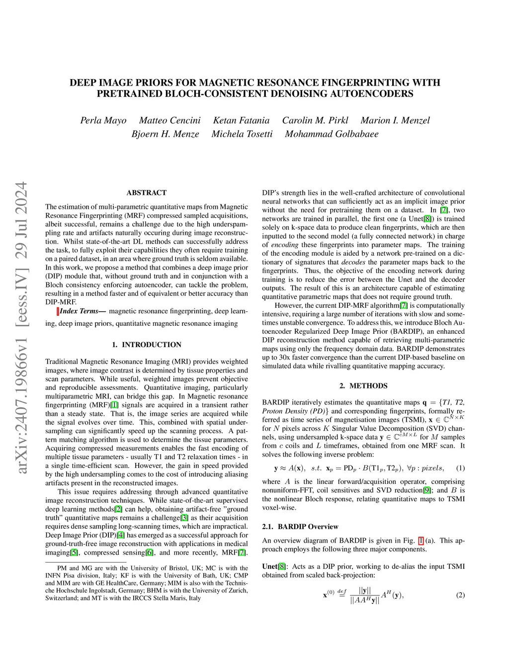The estimation of multi-parametric quantitative maps from Magnetic Resonance Fingerprinting (MRF) compressed sampled acquisitions, albeit successful, remains a challenge due to the high underspampling rate and artifacts naturally occuring during image reconstruction. Whilst state-of-the-art DL methods can successfully address the task, to fully exploit their capabilities they often require training on a paired dataset, in an area where ground truth is seldom available. In this work, we propose a method that combines a deep image prior (DIP) module that, without ground truth and in conjunction with a Bloch consistency enforcing autoencoder, can tackle the problem, resulting in a method faster and of equivalent or better accuracy than DIP-MRF.
