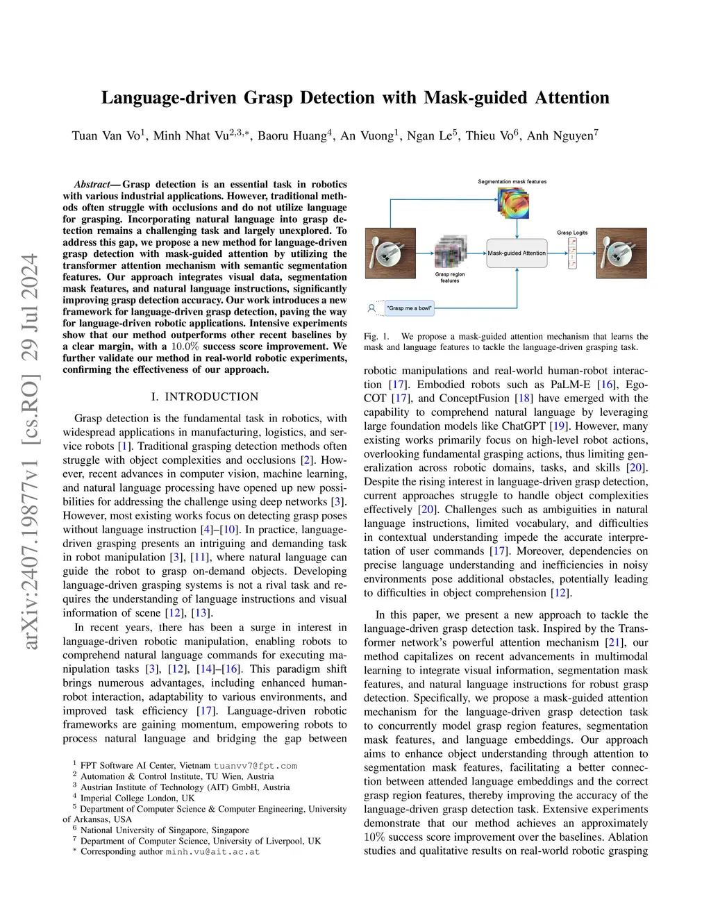 Grasp detection is an essential task in robotics with various industrial applications. However, traditional methods often struggle with occlusions and do not utilize language for grasping. Incorporating natural language into grasp detection remains a challenging task and largely unexplored. To address this gap, we propose a new method for language-driven grasp detection with mask-guided attention by utilizing the transformer attention mechanism with semantic segmentation features. Our approach integrates visual data, segmentation mask features, and natural language instructions, significantly improving grasp detection accuracy. Our work introduces a new framework for language-driven grasp detection, paving the way for language-driven robotic applications. Intensive experiments show that our method outperforms other recent baselines by a clear margin, with a 10.0% success score improvement. We further validate our method in real-world robotic experiments, confirming the effectiveness of our approach.