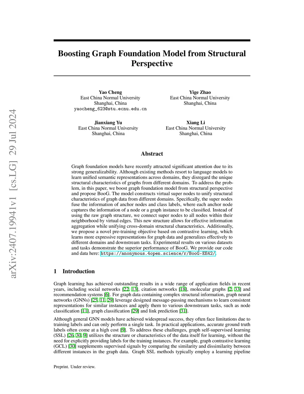 Graph foundation models have recently attracted significant attention due to its strong generalizability. Although existing methods resort to language models to learn unified semantic representations across domains, they disregard the unique structural characteristics of graphs from different domains. To address the problem, in this paper, we boost graph foundation model from structural perspective and propose BooG. The model constructs virtual super nodes to unify structural characteristics of graph data from different domains. Specifically, the super nodes fuse the information of anchor nodes and class labels, where each anchor node captures the information of a node or a graph instance to be classified. Instead of using the raw graph structure, we connect super nodes to all nodes within their neighborhood by virtual edges. This new structure allows for effective information aggregation while unifying cross-domain structural characteristics. Additionally, we propose a novel pre-training objective based on contrastive learning, which learns more expressive representations for graph data and generalizes effectively to different domains and downstream tasks. Experimental results on various datasets and tasks demonstrate the superior performance of BooG. We provide our code and data here:this https URL.