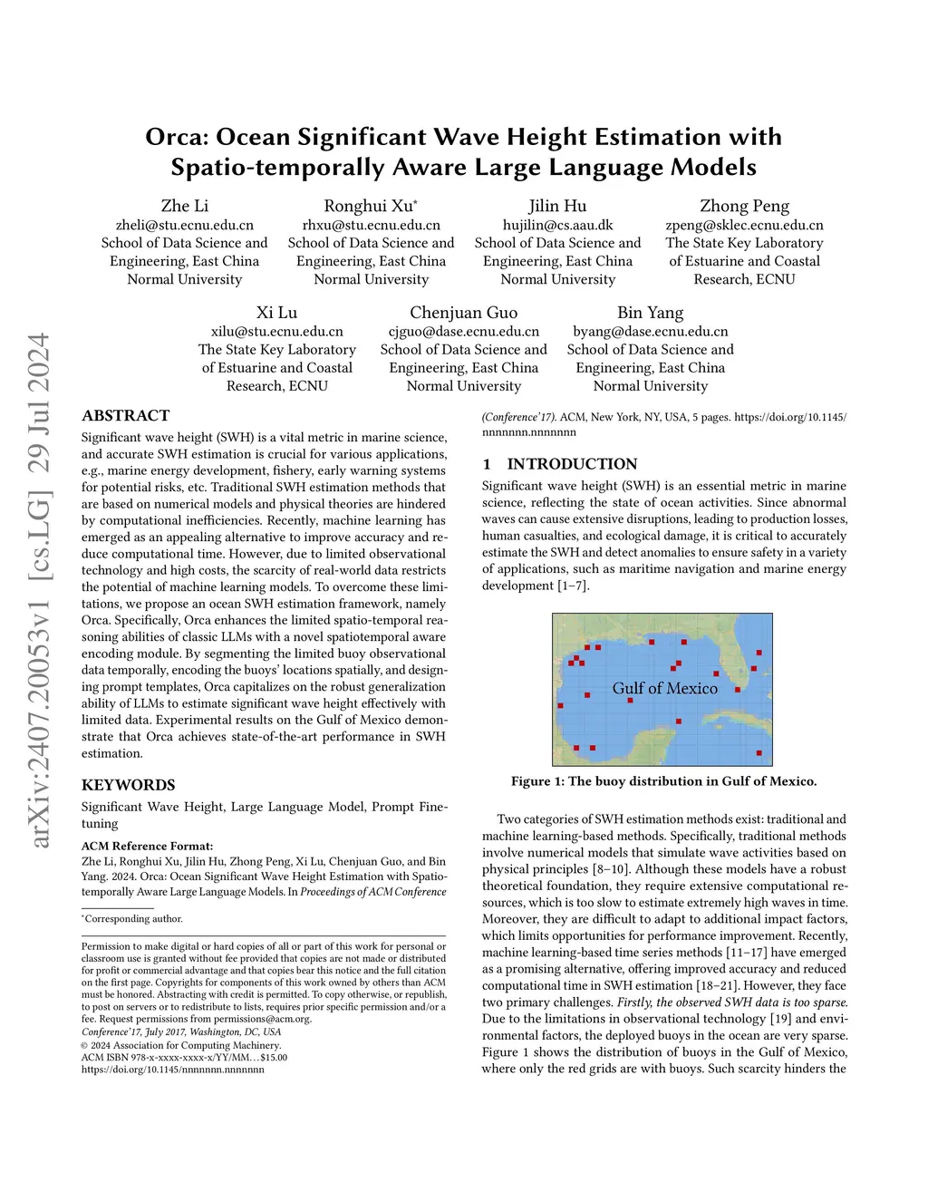 Significant wave height (SWH) is a vital metric in marine science, and accurate SWH estimation is crucial for various applications, e.g., marine energy development, fishery, early warning systems for potential risks, etc. Traditional SWH estimation methods that are based on numerical models and physical theories are hindered by computational inefficiencies. Recently, machine learning has emerged as an appealing alternative to improve accuracy and reduce computational time. However, due to limited observational technology and high costs, the scarcity of real-world data restricts the potential of machine learning models. To overcome these limitations, we propose an ocean SWH estimation framework, namely Orca. Specifically, Orca enhances the limited spatio-temporal reasoning abilities of classic LLMs with a novel spatiotemporal aware encoding module. By segmenting the limited buoy observational data temporally, encoding the buoys' locations spatially, and designing prompt templates, Orca capitalizes on the robust generalization ability of LLMs to estimate significant wave height effectively with limited data. Experimental results on the Gulf of Mexico demonstrate that Orca achieves state-of-the-art performance in SWH estimation.