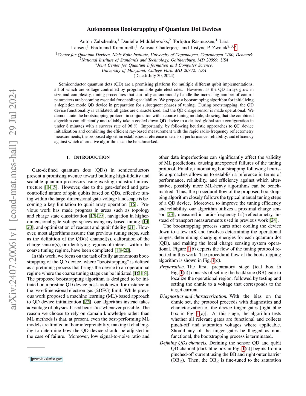 Semiconductor quantum dots (QDs) are a promising platform for multiple different qubit implementations, all of which are voltage controlled by programmable gate electrodes. However, as the QD arrays grow in size and complexity, tuning procedures that can fully autonomously handle the increasing number of control parameters are becoming essential for enabling scalability. We propose a bootstrapping algorithm for initializing a depletion-mode QD device in preparation for subsequent phases of tuning. During bootstrapping, the QD device functionality is validated, all gates are characterized, and the QD charge sensor is made operational. We demonstrate the bootstrapping protocol in conjunction with a coarse-tuning module, showing that the combined algorithm can efficiently and reliably take a cooled-down QD device to a desired global-state configuration in under 8 min with a success rate of 96 %. Finally, by following heuristic approaches to QD device initialization and combining the efficient ray-based measurement with the rapid radio-frequency reflectometry measurements, the proposed algorithm establishes a reference in terms of performance, reliability, and efficiency against which alternative algorithms can be benchmarked.
