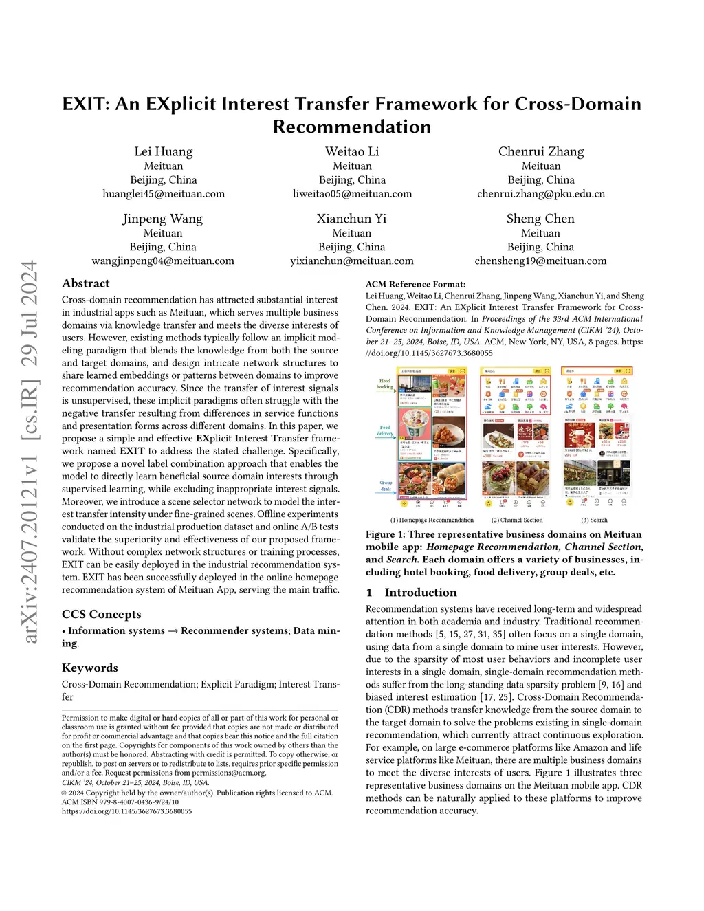 Cross-domain recommendation has attracted substantial interest in industrial apps such as Meituan, which serves multiple business domains via knowledge transfer and meets the diverse interests of users. However, existing methods typically follow an implicit modeling paradigm that blends the knowledge from both the source and target domains, and design intricate network structures to share learned embeddings or patterns between domains to improve recommendation accuracy. Since the transfer of interest signals is unsupervised, these implicit paradigms often struggle with the negative transfer resulting from differences in service functions and presentation forms across different domains. In this paper, we propose a simple and effective EXplicit Interest Transfer framework named EXIT to address the stated challenge. Specifically, we propose a novel label combination approach that enables the model to directly learn beneficial source domain interests through supervised learning, while excluding inappropriate interest signals. Moreover, we introduce a scene selector network to model the interest transfer intensity under fine-grained scenes. Offline experiments conducted on the industrial production dataset and online A/B tests validate the superiority and effectiveness of our proposed framework. Without complex network structures or training processes, EXIT can be easily deployed in the industrial recommendation system. EXIT has been successfully deployed in the online homepage recommendation system of Meituan App, serving the main traffic.