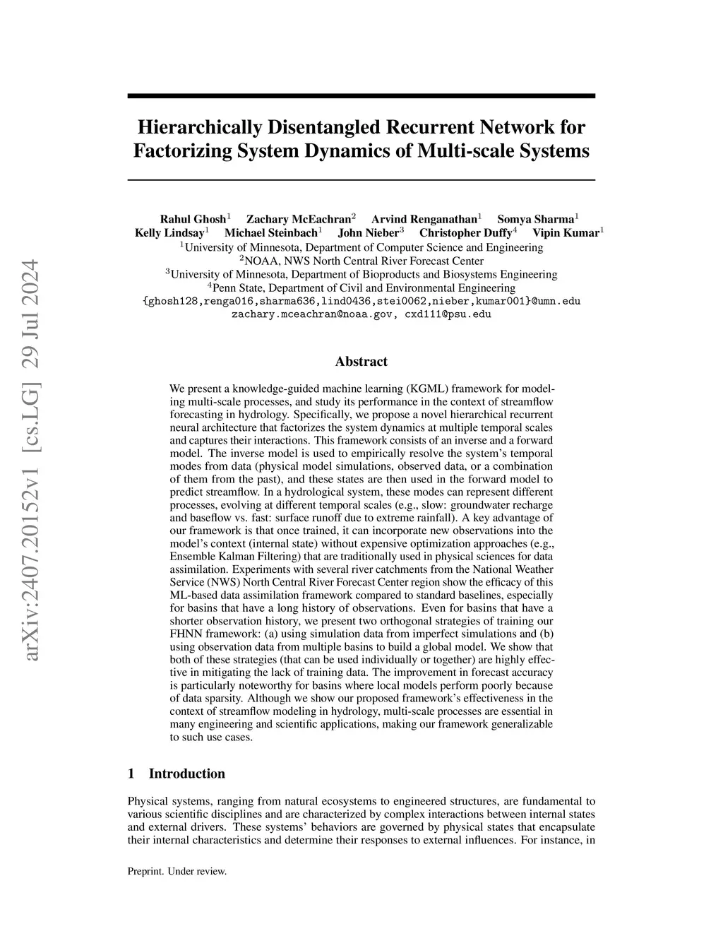 We present a framework for modeling multi-scale processes, and study its performance in the context of streamflow forecasting in hydrology. Specifically, we propose a novel hierarchical recurrent neural architecture that factorizes the system dynamics at multiple temporal scales and captures their interactions. This framework consists of an inverse and a forward model. The inverse model is used to empirically resolve the system's temporal modes from data (physical model simulations, observed data, or a combination of them from the past), and these states are then used in the forward model to predict streamflow. Experiments on several catchments from the National Weather Service North Central River Forecast Center show that FHNN outperforms standard baselines, including physics-based models and transformer-based approaches. The model demonstrates particular effectiveness in catchments with low runoff ratios and colder climates. We further validate FHNN on the CAMELS (Catchment Attributes and MEteorology for Large-sample Studies), which is a widely used continental-scale hydrology benchmark dataset, confirming consistent performance improvements for 1-7 day streamflow forecasts across diverse hydrological conditions. Additionally, we show that FHNN can maintain accuracy even with limited training data through effective pre-training strategies and training global models.