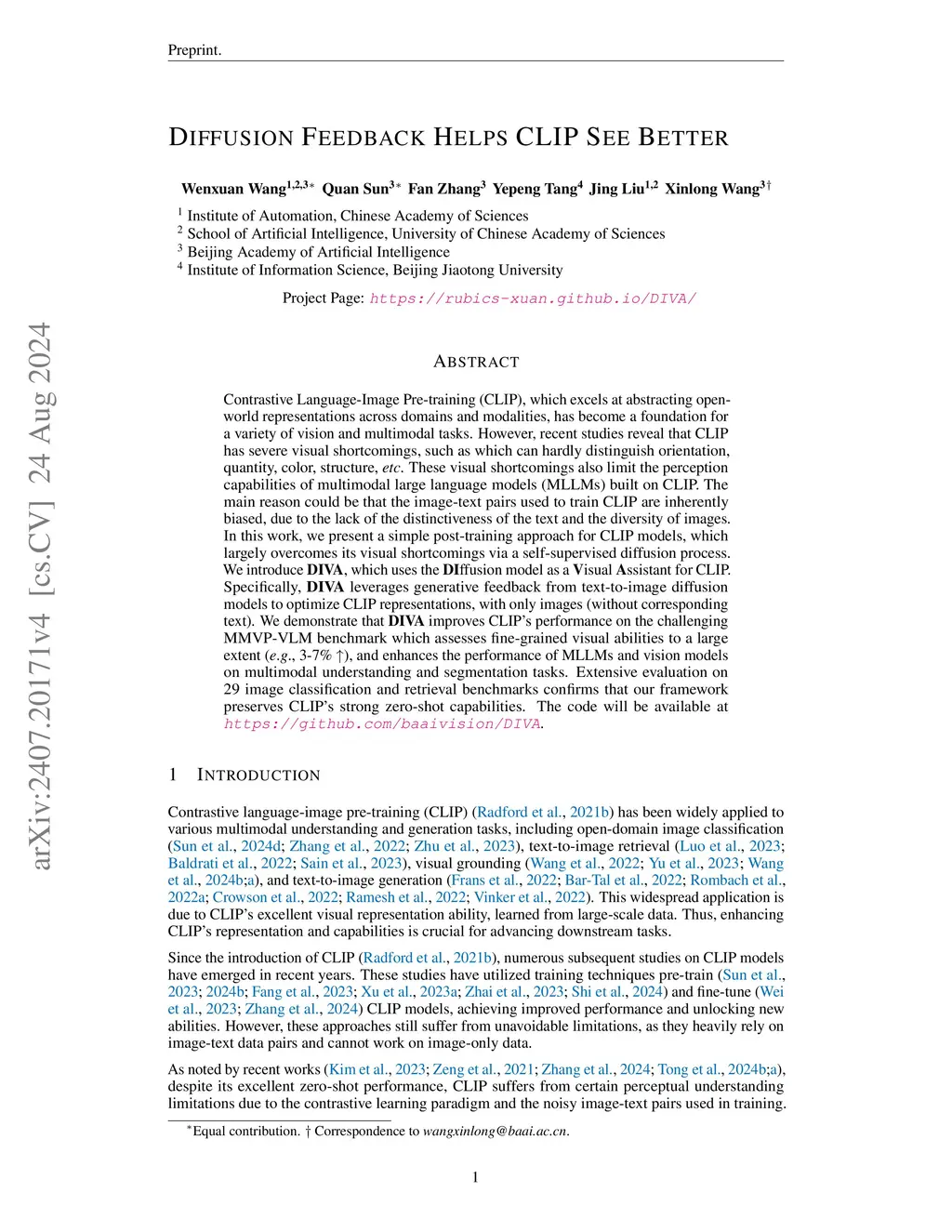 Contrastive Language-Image Pre-training (CLIP), which excels at abstracting open-world representations across domains and modalities, has become a foundation for a variety of vision and multimodal tasks. However, recent studies reveal that CLIP has severe visual shortcomings, such as which can hardly distinguish orientation, quantity, color, structure, etc. These visual shortcomings also limit the perception capabilities of multimodal large language models (MLLMs) built on CLIP. The main reason could be that the image-text pairs used to train CLIP are inherently biased, due to the lack of the distinctiveness of the text and the diversity of images. In this work, we present a simple post-training approach for CLIP models, which largely overcomes its visual shortcomings via a self-supervised diffusion process. We introduce DIVA, which uses the DIffusion model as a Visual Assistant for CLIP. Specifically, DIVA leverages generative feedback from text-to-image diffusion models to optimize CLIP representations, with only images (without corresponding text). We demonstrate that DIVA improves CLIP's performance on the challenging MMVP-VLM benchmark which assesses fine-grained visual abilities to a large extent (e.g., 3-7%), and enhances the performance of MLLMs and vision models on multimodal understanding and segmentation tasks. Extensive evaluation on 29 image classification and retrieval benchmarks confirms that our framework preserves CLIP's strong zero-shot capabilities. The code is available at https://github.com/baaivision/DIVA.