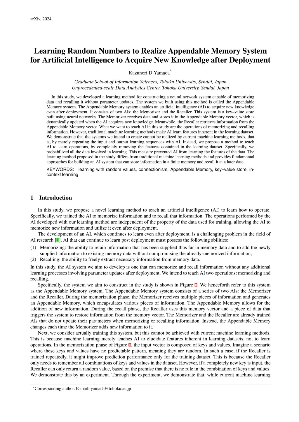In this study, we developed a learning method for constructing a neural network system capable of memorizing data and recalling it without parameter updates. The system we built using this method is called the Appendable Memory system. The Appendable Memory system enables an artificial intelligence (AI) to acquire new knowledge even after deployment. It consists of two AIs: the Memorizer and the Recaller. This system is a key-value store built using neural networks. The Memorizer receives data and stores it in the Appendable Memory vector, which is dynamically updated when the AI acquires new knowledge. Meanwhile, the Recaller retrieves information from the Appendable Memory vector. What we want to teach AI in this study are the operations of memorizing and recalling information. However, traditional machine learning methods make AI learn features inherent in the learning dataset. We demonstrate that the systems we intend to create cannot be realized by current machine learning methods, that is, by merely repeating the input and output learning sequences with AI. Instead, we propose a method to teach AI to learn operations, by completely removing the features contained in the learning dataset. Specifically, we probabilized all the data involved in learning. This measure prevented AI from learning the features of the data. The learning method proposed in the study differs from traditional machine learning methods and provides fundamental approaches for building an AI system that can store information in a finite memory and recall it at a later date.