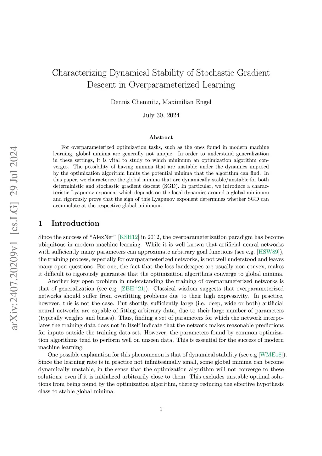 For overparameterized optimization tasks, such as those found in modern machine learning, global minima are generally not unique. In order to understand generalization in these settings, it is vital to study to which minimum an optimization algorithm converges. The possibility of having minima that are unstable under the dynamics imposed by the optimization algorithm limits the potential minima that the algorithm can find. In this paper, we characterize the global minima that are dynamically stable/unstable for both deterministic and stochastic gradient descent (SGD). In particular, we introduce a characteristic Lyapunov exponent that depends on the local dynamics around a global minimum and rigorously prove that the sign of this Lyapunov exponent determines whether SGD can accumulate at the respective global minimum.