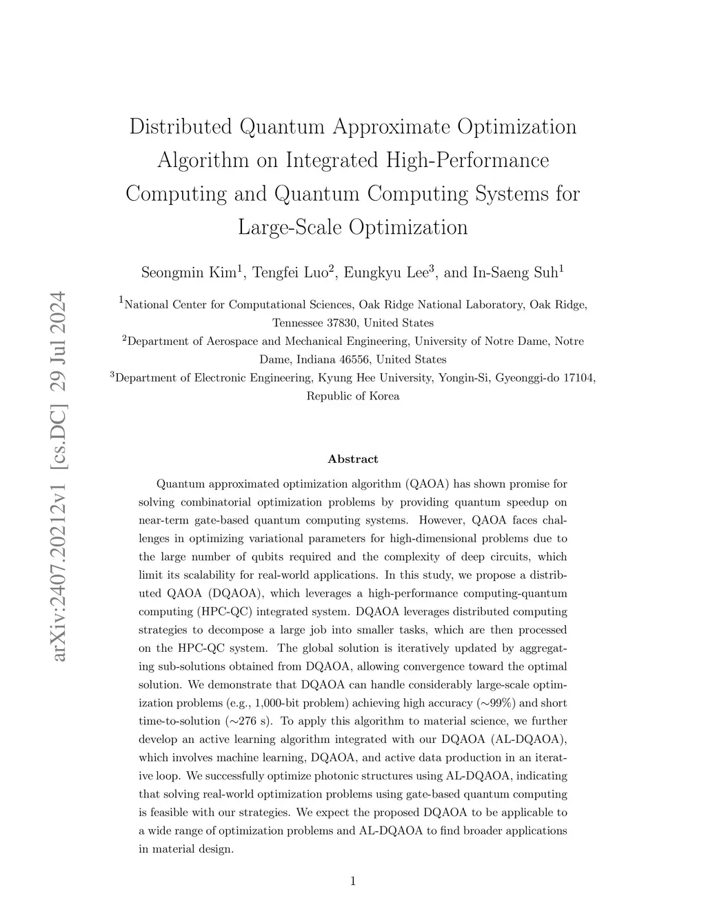 Quantum approximated optimization algorithm (QAOA) has shown promise for solving combinatorial optimization problems by providing quantum speedup on near-term gate-based quantum computing systems. However, QAOA faces challenges in optimizing variational parameters for high-dimensional problems due to the large number of qubits required and the complexity of deep circuits, which limit its scalability for real-world applications. In this study, we propose a distributed QAOA (DQAOA), which leverages a high-performance computing-quantum computing (HPC-QC) integrated system. DQAOA leverages distributed computing strategies to decompose a large job into smaller tasks, which are then processed on the HPC-QC system. The global solution is iteratively updated by aggregating sub-solutions obtained from DQAOA, allowing convergence toward the optimal solution. We demonstrate that DQAOA can handle considerably large-scale optimization problems (e.g., 1,000-bit problem) achieving high accuracy (~99%) and short time-to-solution (~276 s). To apply this algorithm to material science, we further develop an active learning algorithm integrated with our DQAOA (AL-DQAOA), which involves machine learning, DQAOA, and active data production in an iterative loop. We successfully optimize photonic structures using AL-DQAOA, indicating that solving real-world optimization problems using gate-based quantum computing is feasible with our strategies. We expect the proposed DQAOA to be applicable to a wide range of optimization problems and AL-DQAOA to find broader applications in material design.