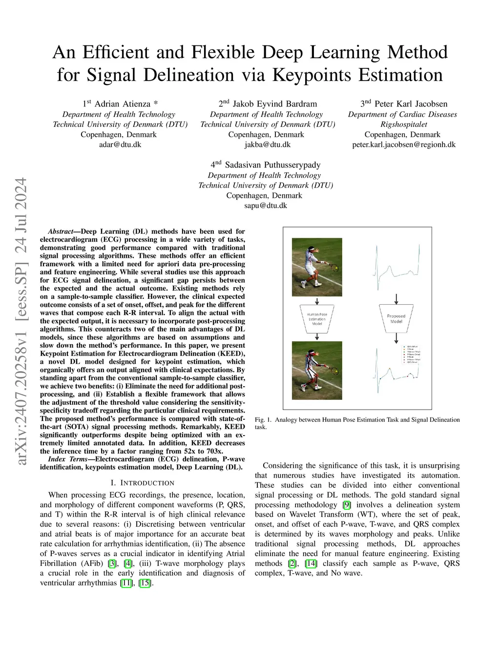 Deep Learning (DL) methods have been used for electrocardiogram (ECG) processing in a wide variety of tasks, demonstrating good performance compared with traditional signal processing algorithms. These methods offer an efficient framework with a limited need for apriori data pre-processing and feature engineering. While several studies use this approach for ECG signal delineation, a significant gap persists between the expected and the actual outcome. Existing methods rely on a sample-to-sample classifier. However, the clinical expected outcome consists of a set of onset, offset, and peak for the different waves that compose each R-R interval. To align the actual with the expected output, it is necessary to incorporate post-processing algorithms. This counteracts two of the main advantages of DL models, since these algorithms are based on assumptions and slow down the method's performance. In this paper, we present Keypoint Estimation for Electrocardiogram Delineation (KEED), a novel DL model designed for keypoint estimation, which organically offers an output aligned with clinical expectations. By standing apart from the conventional sample-to-sample classifier, we achieve two benefits: (i) Eliminate the need for additional post-processing, and (ii) Establish a flexible framework that allows the adjustment of the threshold value considering the sensitivity-specificity tradeoff regarding the particular clinical requirements. The proposed method's performance is compared with state-of-the-art (SOTA) signal processing methods. Remarkably, KEED significantly outperforms despite being optimized with an extremely limited annotated data. In addition, KEED decreases the inference time by a factor ranging from 52x to 703x.