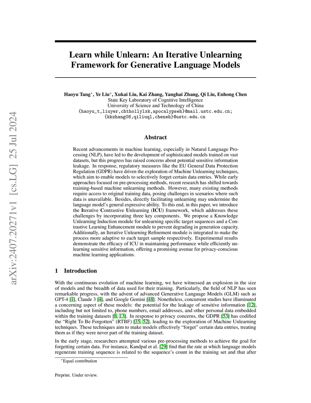 Recent advances in machine learning, particularly in Natural Language Processing (NLP), have produced powerful models trained on vast datasets. However, these models risk leaking sensitive information, raising privacy concerns. In response, regulatory measures such as the European Union's General Data Protection Regulation (GDPR) have driven increasing interest in Machine Unlearning techniques, which enable models to selectively forget specific data entries. Early unlearning approaches primarily relied on pre-processing methods, while more recent research has shifted towards training-based solutions. Despite their effectiveness, a key limitation persists: most methods require access to original training data, which is often unavailable. Additionally, directly applying unlearning techniques bears the cost of undermining the model's expressive capabilities. To address these challenges, we introduce the Iterative Contrastive Unlearning (ICU) framework, which consists of three core components: A Knowledge Unlearning Induction module designed to target specific knowledge for removal using an unlearning loss; A Contrastive Learning Enhancement module to preserve the model's expressive capabilities against the pure unlearning goal; And an Iterative Unlearning Refinement module that dynamically adjusts the unlearning process through ongoing evaluation and updates. Experimental results demonstrate the efficacy of our ICU method in unlearning sensitive information while maintaining the model's overall performance, offering a promising solution for privacy-conscious machine learning applications.