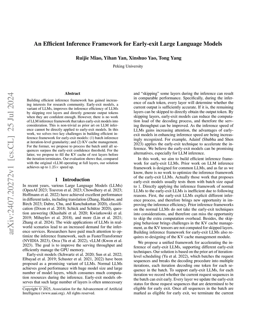 Building efficient inference framework has gained increasing interests for research community. Early-exit models, a variant of LLMs, improves the inference efficiency of LLMs by skipping rest layers and directly generate output tokens when they are confident enough. However, there is no work of LLM inference framework that takes early-exit models into consideration. This is non-trivial as prior art on LLM inference cannot be directly applied to early-exit models. In this work, we solves two key challenges in building efficient inference framework for early-exit models: (1) batch inference at iteration-level granularity; and (2) KV cache management. For the former, we propose to process the batch until all sequences surpass the early-exit confidence threshold. For the latter, we propose to fill the KV cache of rest layers before the iteration terminates. Our evaluation shows that, compared with the original vLLM operating at full layers, our solution achieves up to 1.25x speed up.