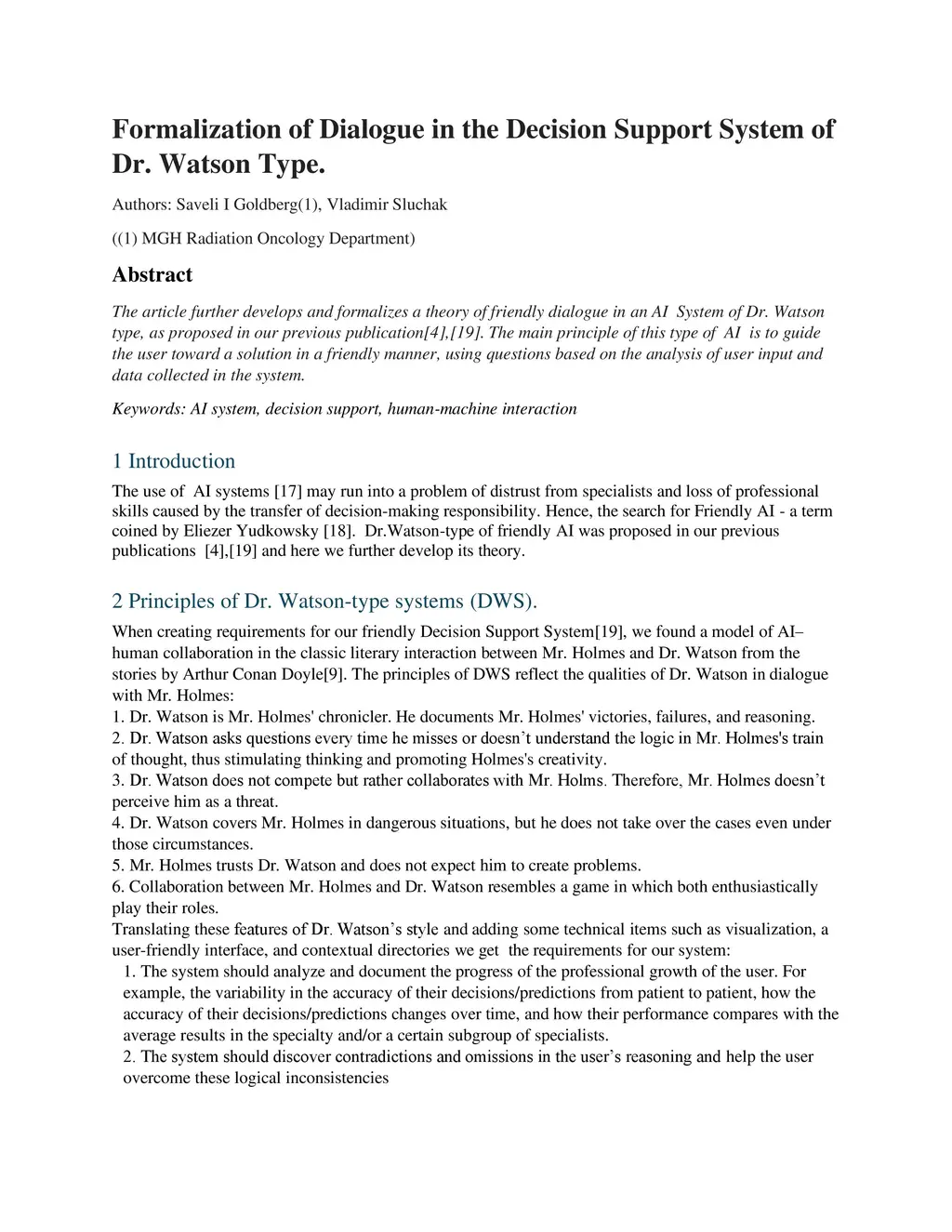 The article further develops and formalizes a theory of friendly dialogue in an AI System of Dr. Watson type, as proposed in our previous publication[4],[19]. The main principle of this type of AI is to guide the user toward a solution in a friendly manner, using questions based on the analysis of user input and data collected in the system.