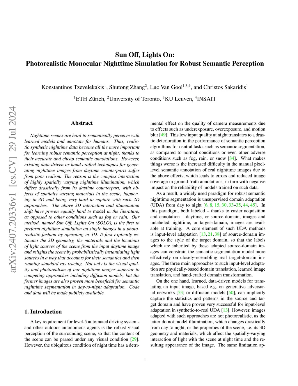 Nighttime scenes are hard to semantically perceive with learned models and annotate for humans. Thus, realistic synthetic nighttime data become all the more important for learning robust semantic perception at night, thanks to their accurate and cheap semantic annotations. However, existing data-driven or hand-crafted techniques for generating nighttime images from daytime counterparts suffer from poor realism. The reason is the complex interaction of highly spatially varying nighttime illumination, which differs drastically from its daytime counterpart, with objects of spatially varying materials in the scene, happening in 3D and being very hard to capture with such 2D approaches. The above 3D interaction and illumination shift have proven equally hard to model in the literature, as opposed to other conditions such as fog or rain. Our method, named Sun Off, Lights On (SOLO), is the first to perform nighttime simulation on single images in a photorealistic fashion by operating in 3D. It first explicitly estimates the 3D geometry, the materials and the locations of light sources of the scene from the input daytime image and relights the scene by probabilistically instantiating light sources in a way that accounts for their semantics and then running standard ray tracing. Not only is the visual quality and photorealism of our nighttime images superior to competing approaches including diffusion models, but the former images are also proven more beneficial for semantic nighttime segmentation in day-to-night adaptation. Code and data will be made publicly available.