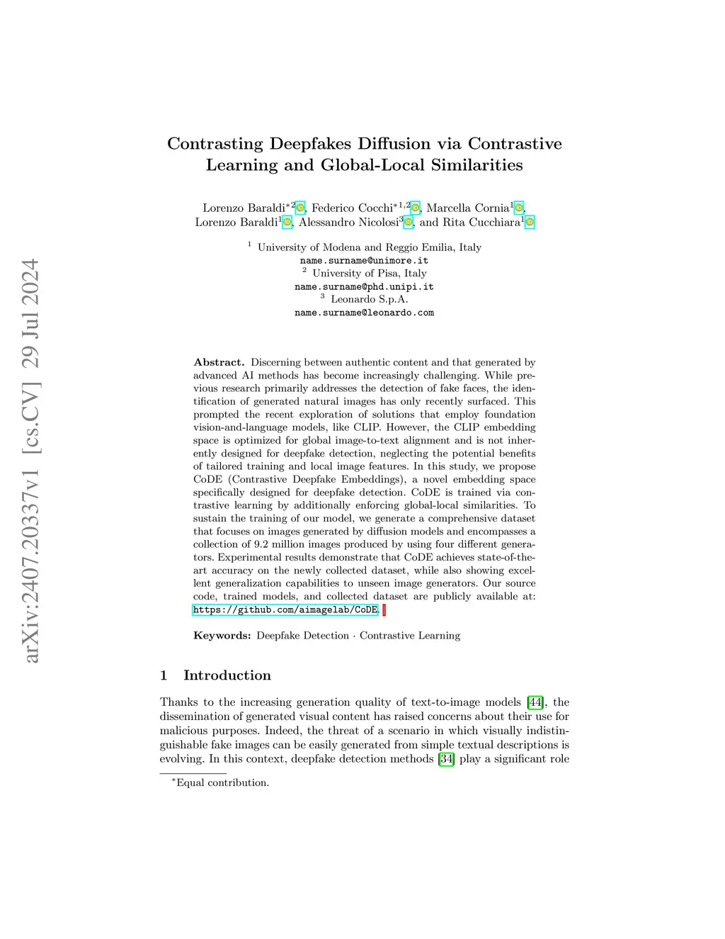 Discerning between authentic content and that generated by advanced AI methods has become increasingly challenging. While previous research primarily addresses the detection of fake faces, the identification of generated natural images has only recently surfaced. This prompted the recent exploration of solutions that employ foundation vision-and-language models, like CLIP. However, the CLIP embedding space is optimized for global image-to-text alignment and is not inherently designed for deepfake detection, neglecting the potential benefits of tailored training and local image features. In this study, we propose CoDE (Contrastive Deepfake Embeddings), a novel embedding space specifically designed for deepfake detection. CoDE is trained via contrastive learning by additionally enforcing global-local similarities. To sustain the training of our model, we generate a comprehensive dataset that focuses on images generated by diffusion models and encompasses a collection of 9.2 million images produced by using four different generators. Experimental results demonstrate that CoDE achieves state-of-the-art accuracy on the newly collected dataset, while also showing excellent generalization capabilities to unseen image generators. Our source code, trained models, and collected dataset are publicly available at: https://github.com/aimagelab/CoDE.
