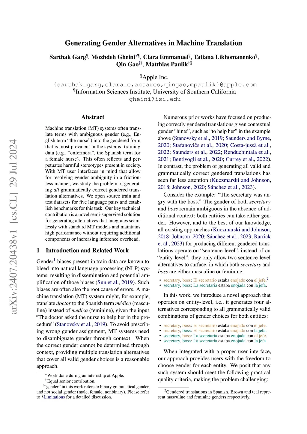 Machine translation (MT) systems often translate terms with ambiguous gender (e.g., English term "the nurse") into the gendered form that is most prevalent in the systems' training data (e.g., "enfermera", the Spanish term for a female nurse). This often reflects and perpetuates harmful stereotypes present in society. With MT user interfaces in mind that allow for resolving gender ambiguity in a frictionless manner, we study the problem of generating all grammatically correct gendered translation alternatives. We open source train and test datasets for five language pairs and establish benchmarks for this task. Our key technical contribution is a novel semi-supervised solution for generating alternatives that integrates seamlessly with standard MT models and maintains high performance without requiring additional components or increasing inference overhead.