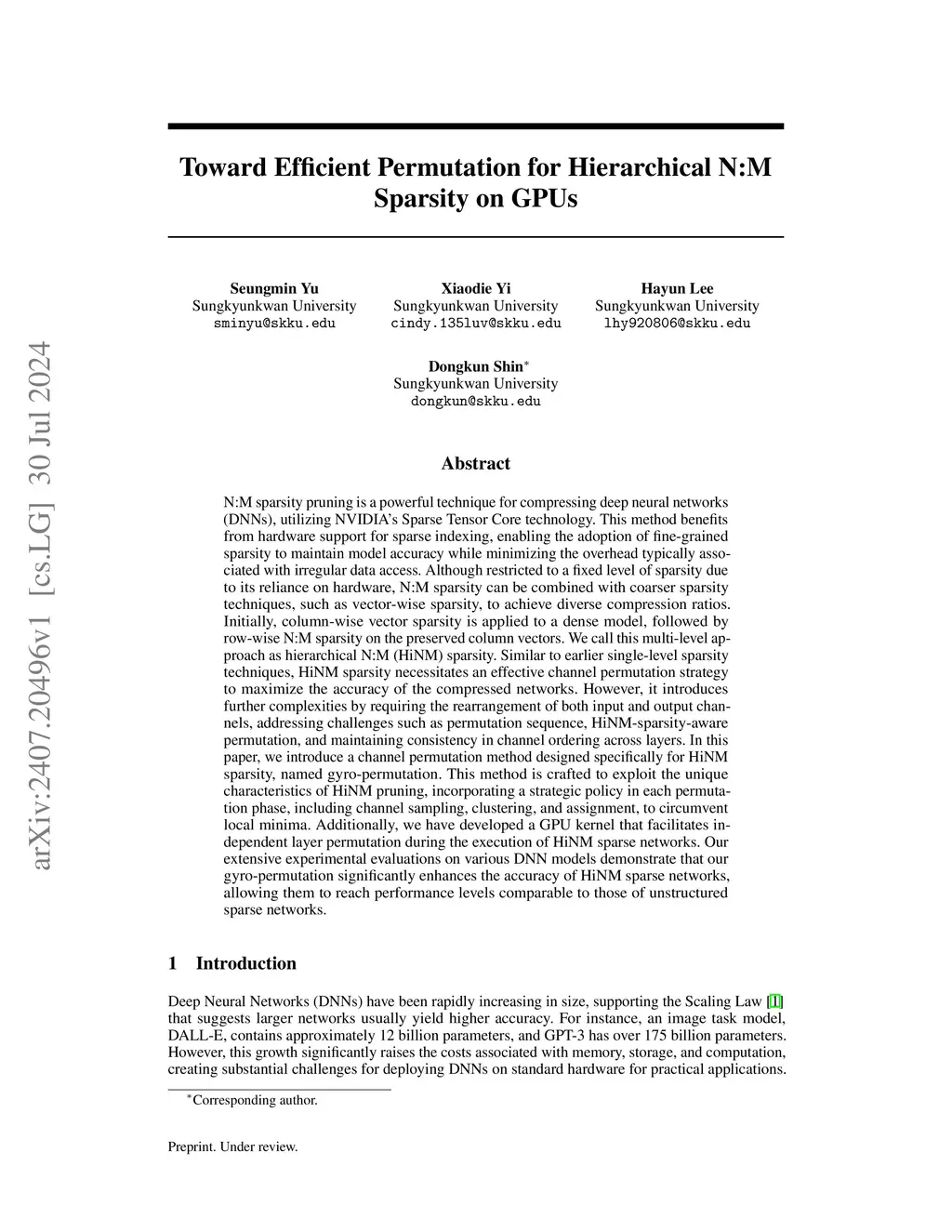 N:M sparsity pruning is a powerful technique for compressing deep neural networks, utilizing NVIDIA's Sparse Tensor Core technology. This method benefits from hardware support for sparse indexing, enabling the adoption of fine-grained sparsity to maintain model accuracy while minimizing the overhead typically associated with irregular data access. Although restricted to a fixed level of sparsity due to its reliance on hardware, N:M sparsity can be combined with coarser sparsity techniques to achieve diverse compression ratios. Initially, column-wise vector sparsity is applied to a dense model, followed by row-wise N:M sparsity on the preserved column vectors. We call this multi-level approach as hierarchical N:M (HiNM) sparsity. Similar to earlier single-level sparsity techniques, HiNM sparsity necessitates an effective channel permutation strategy to maximize the accuracy of the compressed networks. However, it introduces further complexities by requiring the rearrangement of both input and output channels, addressing challenges such as permutation sequence, HiNM-sparsity-aware permutation, and maintaining consistency in channel ordering across layers. In this paper, we introduce a channel permutation method designed specifically for HiNM sparsity, named gyro-permutation. This method is crafted to exploit the unique characteristics of HiNM pruning, incorporating a strategic policy in each permutation phase, including channel sampling, clustering, and assignment, to circumvent local minima. Additionally, we have developed a GPU kernel that facilitates independent layer permutation during the execution of HiNM sparse networks. Our extensive experimental evaluations on various DNN models demonstrate that our gyro-permutation significantly enhances the accuracy of HiNM sparse networks, allowing them to reach performance levels comparable to those of unstructured sparse networks.