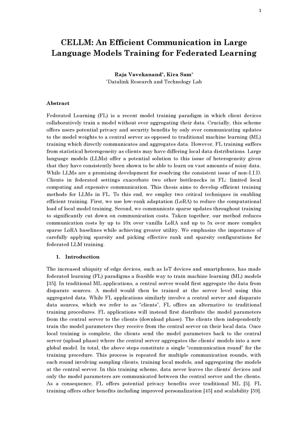Federated Learning (FL) is a recent model training paradigm in which client devices collaboratively train a model without ever aggregating their data. Crucially, this scheme offers users potential privacy and security benefits by only ever communicating updates to the model weights to a central server as opposed to traditional machine learning (ML) training which directly communicates and aggregates data. However, FL training suffers from statistical heterogeneity as clients may have differing local data distributions. Large language models (LLMs) offer a potential solution to this issue of heterogeneity given that they have consistently been shown to be able to learn on vast amounts of noisy data. While LLMs are a promising development for resolving the consistent issue of non-I.I.D. Clients in federated settings exacerbate two other bottlenecks in FL: limited local computing and expensive communication. This thesis aims to develop efficient training methods for LLMs in FL. To this end, we employ two critical techniques in enabling efficient training. First, we use low-rank adaptation (LoRA) to reduce the computational load of local model training. Second, we communicate sparse updates throughout training to significantly cut down on communication costs. Taken together, our method reduces communication costs by up to 10x over vanilla LoRA and up to 5x over more complex sparse LoRA baselines while achieving greater utility. We emphasize the importance of carefully applying sparsity and picking effective rank and sparsity configurations for federated LLM training.
