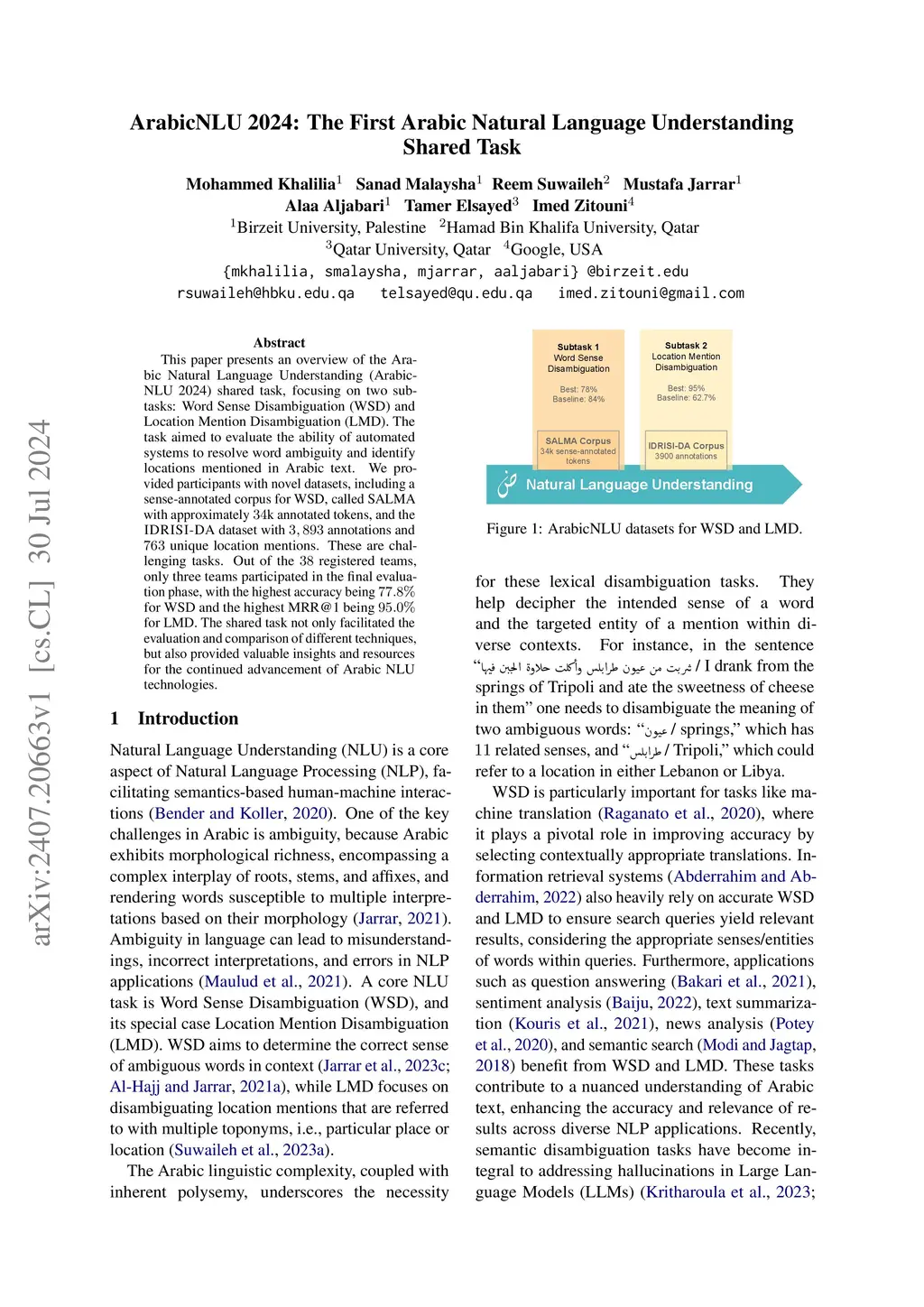 This paper presents an overview of the Arabic Natural Language Understanding (ArabicNLU 2024) shared task, focusing on two subtasks: Word Sense Disambiguation (WSD) and Location Mention Disambiguation (LMD). The task aimed to evaluate the ability of automated systems to resolve word ambiguity and identify locations mentioned in Arabic text. We provided participants with novel datasets, including a sense-annotated corpus for WSD, called SALMA with approximately 34k annotated tokens, and the IDRISI-DA dataset with 3,893 annotations and 763 unique location mentions. These are challenging tasks. Out of the 38 registered teams, only three teams participated in the final evaluation phase, with the highest accuracy being 77.8% for WSD and the highest MRR@1 being 95.0% for LMD. The shared task not only facilitated the evaluation and comparison of different techniques, but also provided valuable insights and resources for the continued advancement of Arabic NLU technologies.