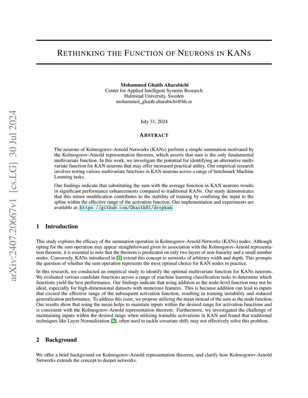 The neurons of Kolmogorov-Arnold Networks (KANs) perform a simple summation motivated by the Kolmogorov-Arnold representation theorem, which asserts that sum is the only fundamental multivariate function. In this work, we investigate the potential for identifying an alternative multivariate function for KAN neurons that may offer increased practical utility. Our empirical research involves testing various multivariate functions in KAN neurons across a range of benchmark Machine Learning tasks. Our findings indicate that substituting the sum with the average function in KAN neurons results in significant performance enhancements compared to traditional KANs. Our study demonstrates that this minor modification contributes to the stability of training by confining the input to the spline within the effective range of the activation function. Our implementation and experiments are available at: \url{https://github.com/Ghaith81/dropkan}