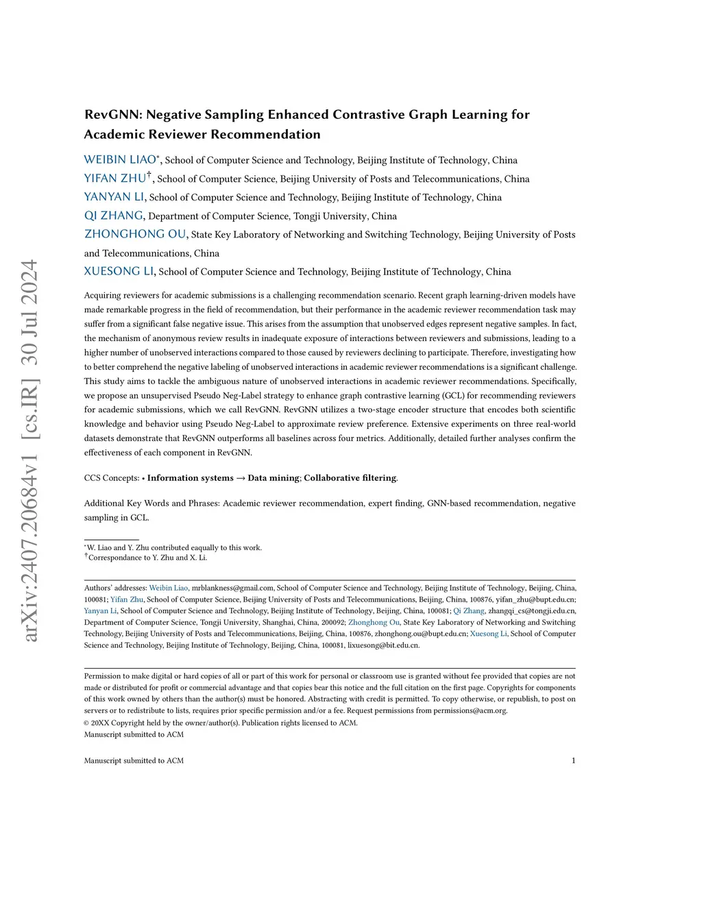 Acquiring reviewers for academic submissions is a challenging recommendation scenario. Recent graph learning-driven models have made remarkable progress in the field of recommendation, but their performance in the academic reviewer recommendation task may suffer from a significant false negative issue. This arises from the assumption that unobserved edges represent negative samples. In fact, the mechanism of anonymous review results in inadequate exposure of interactions between reviewers and submissions, leading to a higher number of unobserved interactions compared to those caused by reviewers declining to participate. Therefore, investigating how to better comprehend the negative labeling of unobserved interactions in academic reviewer recommendations is a significant challenge. This study aims to tackle the ambiguous nature of unobserved interactions in academic reviewer recommendations. Specifically, we propose an unsupervised Pseudo Neg-Label strategy to enhance graph contrastive learning (GCL) for recommending reviewers for academic submissions, which we call RevGNN. RevGNN utilizes a two-stage encoder structure that encodes both scientific knowledge and behavior using Pseudo Neg-Label to approximate review preference. Extensive experiments on three real-world datasets demonstrate that RevGNN outperforms all baselines across four metrics. Additionally, detailed further analyses confirm the effectiveness of each component in RevGNN.