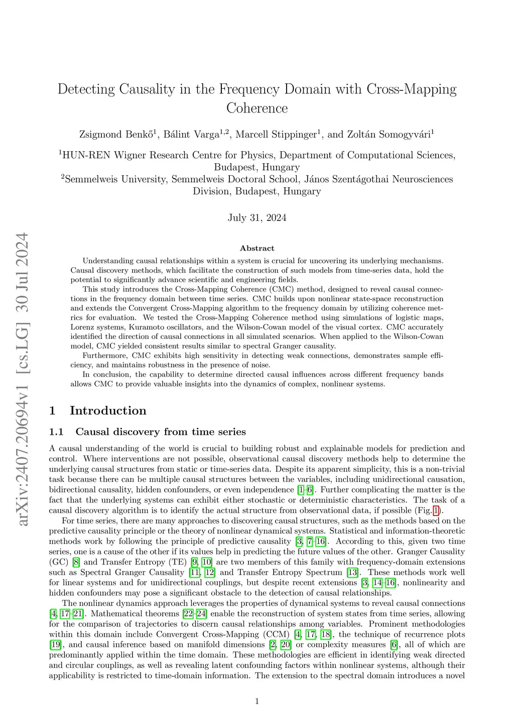 Understanding causal relationships within a system is crucial for uncovering its underlying mechanisms. Causal discovery methods, which facilitate the construction of such models from time-series data, hold the potential to significantly advance scientific and engineering fields. This study introduces the Cross-Mapping Coherence (CMC) method, designed to reveal causal connections in the frequency domain between time series. CMC builds upon nonlinear state-space reconstruction and extends the Convergent Cross-Mapping algorithm to the frequency domain by utilizing coherence metrics for evaluation. We tested the Cross-Mapping Coherence method using simulations of logistic maps, Lorenz systems, Kuramoto oscillators, and the Wilson-Cowan model of the visual cortex. CMC accurately identified the direction of causal connections in all simulated scenarios. When applied to the Wilson-Cowan model, CMC yielded consistent results similar to spectral Granger causality. Furthermore, CMC exhibits high sensitivity in detecting weak connections, demonstrates sample efficiency, and maintains robustness in the presence of noise. In conclusion, the capability to determine directed causal influences across different frequency bands allows CMC to provide valuable insights into the dynamics of complex, nonlinear systems.