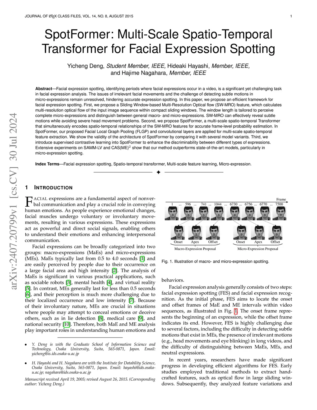 Facial expression spotting, identifying periods where facial expressions occur in a video, is a significant yet challenging task in facial expression analysis. The issues of irrelevant facial movements and the challenge of detecting subtle motions in micro-expressions remain unresolved, hindering accurate expression spotting. In this paper, we propose an efficient framework for facial expression spotting. First, we propose a Sliding Window-based multi-temporal-resolution Optical flow (SW-MRO) feature, which calculates multi-temporal-resolution optical flow of the input image sequence within compact sliding windows. The window length is tailored to perceive complete micro-expressions and distinguish between general macro- and micro-expressions. SW-MRO can effectively reveal subtle motions while avoiding the optical flow being dominated by head movements. Second, we propose SpotFormer, a multi-scale spatio-temporal Transformer that simultaneously encodes spatio-temporal relationships of the SW-MRO features for accurate frame-level probability estimation. In SpotFormer, we use the proposed Facial Local Graph Pooling (FLGP) operation and convolutional layers to extract multi-scale spatio-temporal features. We show the validity of the architecture of SpotFormer by comparing it with several model variants. Third, we introduce supervised contrastive learning into SpotFormer to enhance the discriminability between different types of expressions. Extensive experiments on SAMM-LV, CAS(ME)^2, and CAS(ME)^3 show that our method outperforms state-of-the-art models, particularly in micro-expression spotting.