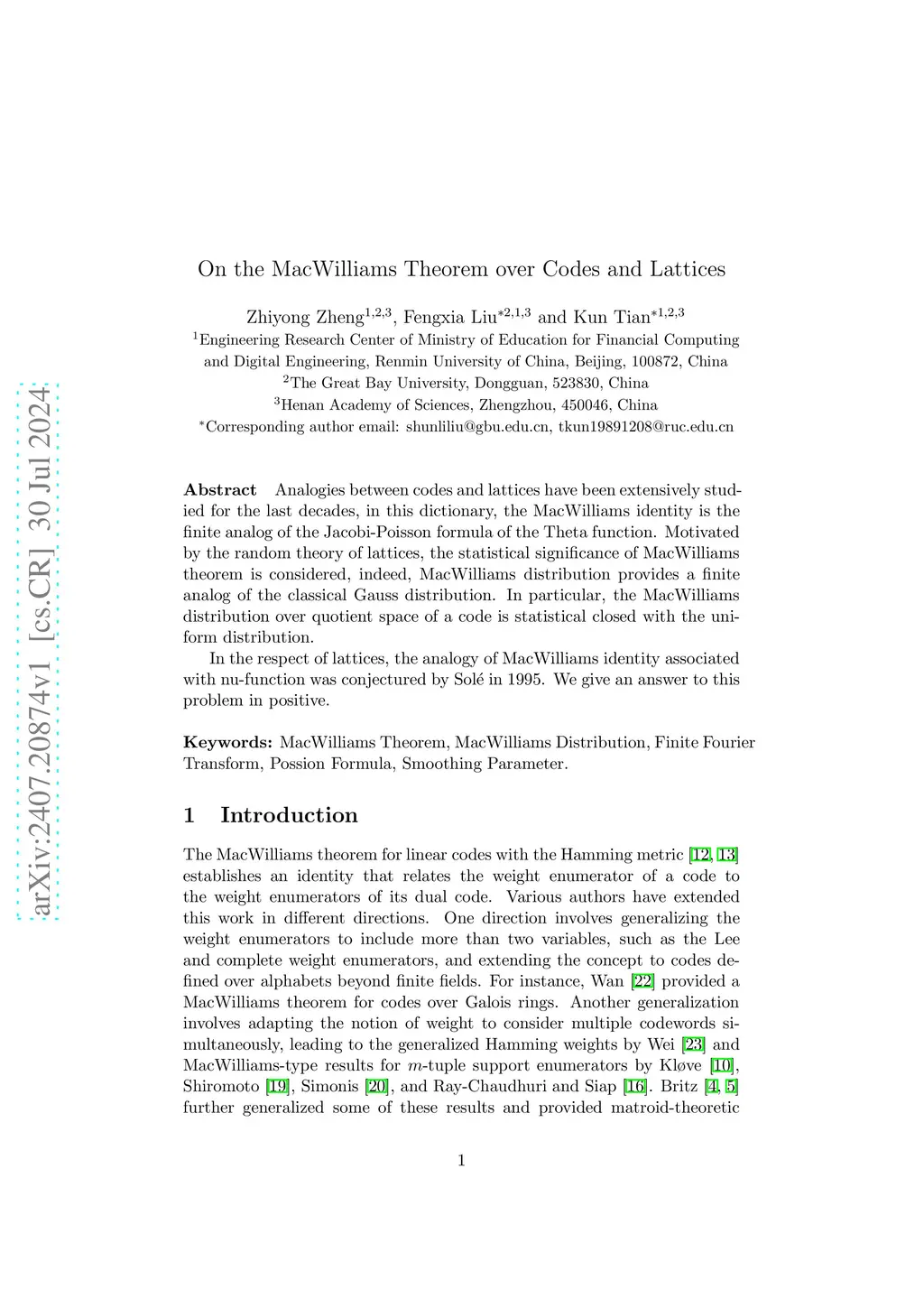 Analogies between codes and lattices have been extensively studied for the last decades, in this dictionary, the MacWilliams identity is the finite analog of the Jacobi-Poisson formula of the Theta function. Motivated by the random theory of lattices, the statistical significance of MacWilliams theorem is considered, indeed, MacWilliams distribution provides a finite analog of the classical Gauss distribution. In particular, the MacWilliams distribution over quotient space of a code is statistical close to the uniform distribution. In the respect of lattices, the analogy of MacWilliams identity associated with nu-function was conjectured by Sole in 1995. We give an answer to this problem in positive.