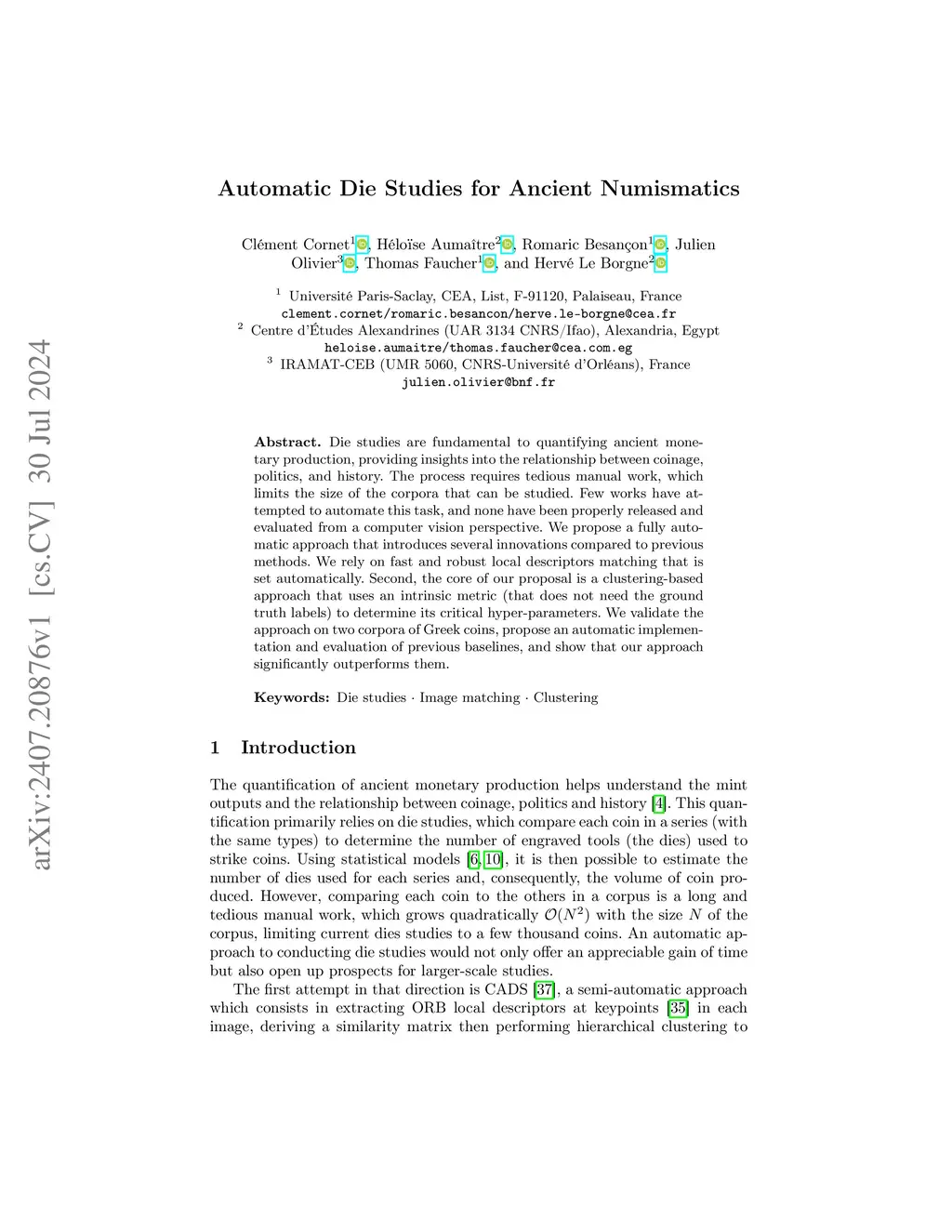 Die studies are fundamental to quantifying ancient monetary production, providing insights into the relationship between coinage, politics, and history. The process requires tedious manual work, which limits the size of the corpora that can be studied. Few works have attempted to automate this task, and none have been properly released and evaluated from a computer vision perspective. We propose a fully automatic approach that introduces several innovations compared to previous methods. We rely on fast and robust local descriptors matching that is set automatically. Second, the core of our proposal is a clustering-based approach that uses an intrinsic metric (that does not need the ground truth labels) to determine its critical hyper-parameters. We validate the approach on two corpora of Greek coins, propose an automatic implementation and evaluation of previous baselines, and show that our approach significantly outperforms them.