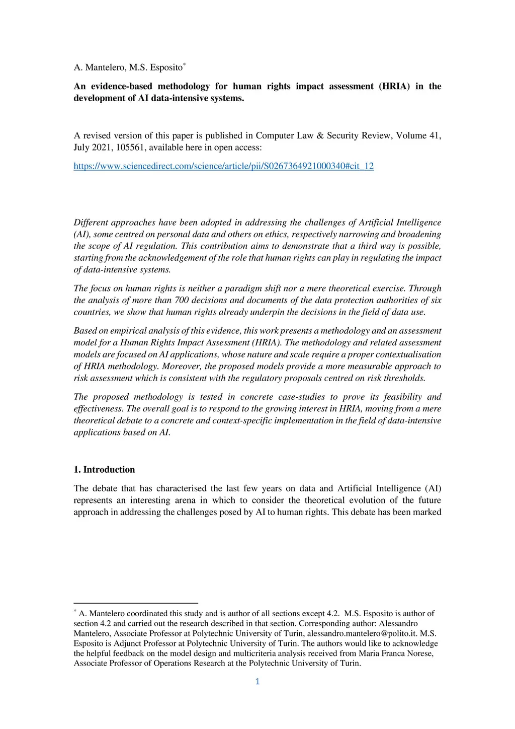 Different approaches have been adopted in addressing the challenges of Artificial Intelligence (AI), some centred on personal data and others on ethics, respectively narrowing and broadening the scope of AI regulation. This contribution aims to demonstrate that a third way is possible, starting from the acknowledgement of the role that human rights can play in regulating the impact of data-intensive systems. The focus on human rights is neither a paradigm shift nor a mere theoretical exercise. Through the analysis of more than 700 decisions and documents of the data protection authorities of six countries, we show that human rights already underpin the decisions in the field of data use. Based on empirical analysis of this evidence, this work presents a methodology and a model for a Human Rights Impact Assessment (HRIA). The methodology and related assessment model are focused on AI applications, whose nature and scale require a proper contextualisation of HRIA methodology. Moreover, the proposed models provide a more measurable approach to risk assessment which is consistent with the regulatory proposals centred on risk thresholds. The proposed methodology is tested in concrete case-studies to prove its feasibility and effectiveness. The overall goal is to respond to the growing interest in HRIA, moving from a mere theoretical debate to a concrete and context-specific implementation in the field of data-intensive applications based on AI.