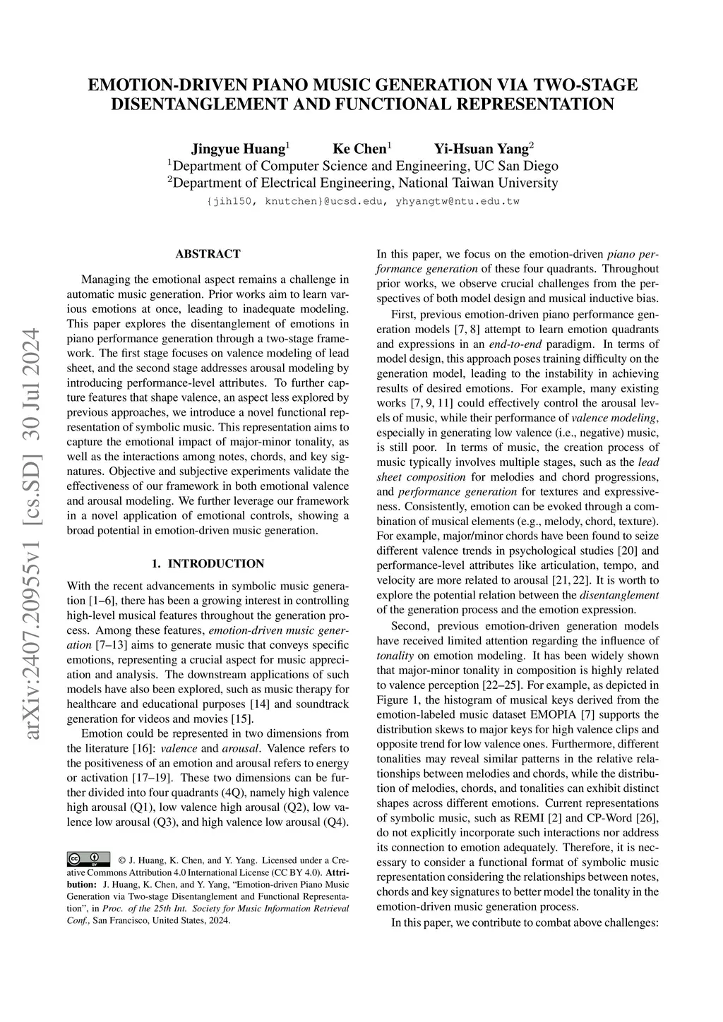 Managing the emotional aspect remains a challenge in automatic music generation. Prior works aim to learn various emotions at once, leading to inadequate modeling. This paper explores the disentanglement of emotions in piano performance generation through a two-stage framework. The first stage focuses on valence modeling of lead sheet, and the second stage addresses arousal modeling by introducing performance-level attributes. To further capture features that shape valence, an aspect less explored by previous approaches, we introduce a novel functional representation of symbolic music. This representation aims to capture the emotional impact of major-minor tonality, as well as the interactions among notes, chords, and key signatures. Objective and subjective experiments validate the effectiveness of our framework in both emotional valence and arousal modeling. We further leverage our framework in a novel application of emotional controls, showing a broad potential in emotion-driven music generation.