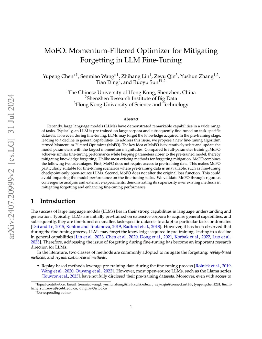 MoFO: Momentum-Filtered Optimizer for Mitigating Forgetting in LLM Fine-Tuning