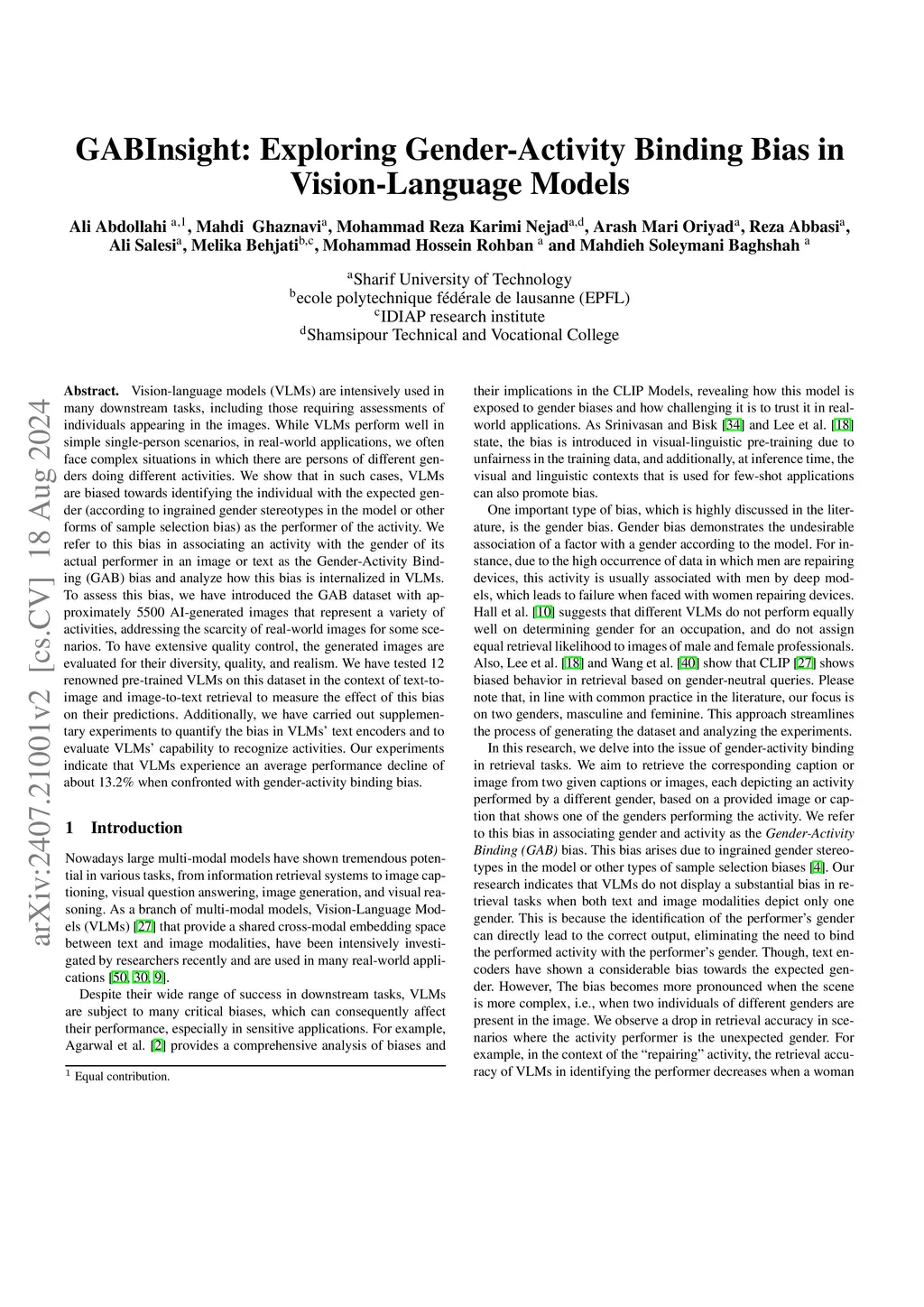 Vision-language models (VLMs) are intensively used in many downstream tasks, including those requiring assessments of individuals appearing in the images. While VLMs perform well in simple single-person scenarios, in real-world applications, we often face complex situations in which there are persons of different genders doing different activities. We show that in such cases, VLMs are biased towards identifying the individual with the expected gender (according to ingrained gender stereotypes in the model or other forms of sample selection bias) as the performer of the activity. We refer to this bias in associating an activity with the gender of its actual performer in an image or text as the Gender-Activity Binding (GAB) bias and analyze how this bias is internalized in VLMs. To assess this bias, we have introduced the GAB dataset with approximately 5500 AI-generated images that represent a variety of activities, addressing the scarcity of real-world images for some scenarios. To have extensive quality control, the generated images are evaluated for their diversity, quality, and realism. We have tested 12 renowned pre-trained VLMs on this dataset in the context of text-to-image and image-to-text retrieval to measure the effect of this bias on their predictions. Additionally, we have carried out supplementary experiments to quantify the bias in VLMs' text encoders and to evaluate VLMs' capability to recognize activities. Our experiments indicate that VLMs experience an average performance decline of about 13.2% when confronted with gender-activity binding bias.