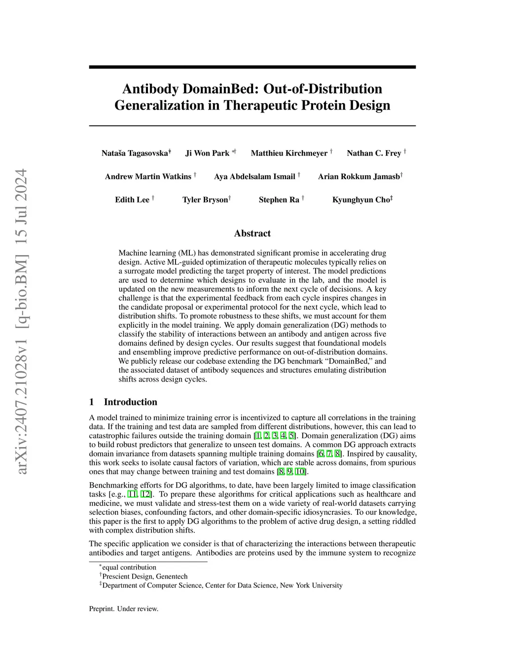 Machine learning (ML) has demonstrated significant promise in accelerating drug design. Active ML-guided optimization of therapeutic molecules typically relies on a surrogate model predicting the target property of interest. The model predictions are used to determine which designs to evaluate in the lab, and the model is updated on the new measurements to inform the next cycle of decisions. A key challenge is that the experimental feedback from each cycle inspires changes in the candidate proposal or experimental protocol for the next cycle, which lead to distribution shifts. To promote robustness to these shifts, we must account for them explicitly in the model training. We apply domain generalization (DG) methods to classify the stability of interactions between an antibody and antigen across five domains defined by design cycles. Our results suggest that foundational models and ensembling improve predictive performance on out-of-distribution domains. We publicly release our codebase extending the DG benchmark ``DomainBed,'' and the associated dataset of antibody sequences and structures emulating distribution shifts across design cycles.