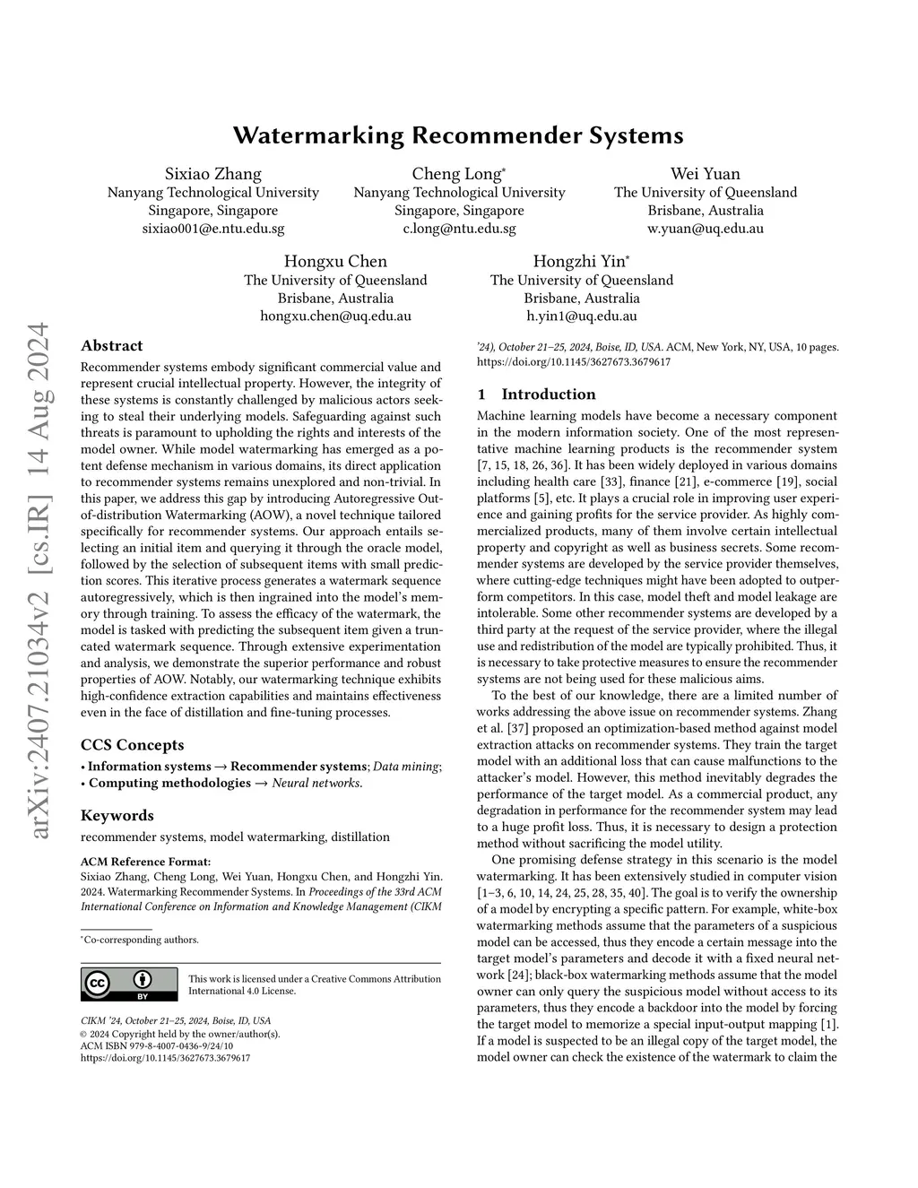 Recommender systems embody significant commercial value and represent crucial intellectual property. However, the integrity of these systems is constantly challenged by malicious actors seeking to steal their underlying models. Safeguarding against such threats is paramount to upholding the rights and interests of the model owner. While model watermarking has emerged as a potent defense mechanism in various domains, its direct application to recommender systems remains unexplored and non-trivial. In this paper, we address this gap by introducing Autoregressive Out-of-distribution Watermarking (AOW), a novel technique tailored specifically for recommender systems. Our approach entails selecting an initial item and querying it through the oracle model, followed by the selection of subsequent items with small prediction scores. This iterative process generates a watermark sequence autoregressively, which is then ingrained into the model's memory through training. To assess the efficacy of the watermark, the model is tasked with predicting the subsequent item given a truncated watermark sequence. Through extensive experimentation and analysis, we demonstrate the superior performance and robust properties of AOW. Notably, our watermarking technique exhibits high-confidence extraction capabilities and maintains effectiveness even in the face of distillation and fine-tuning processes.